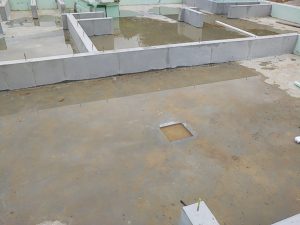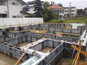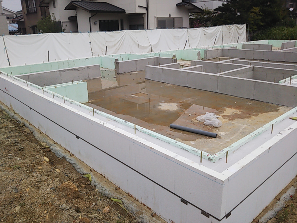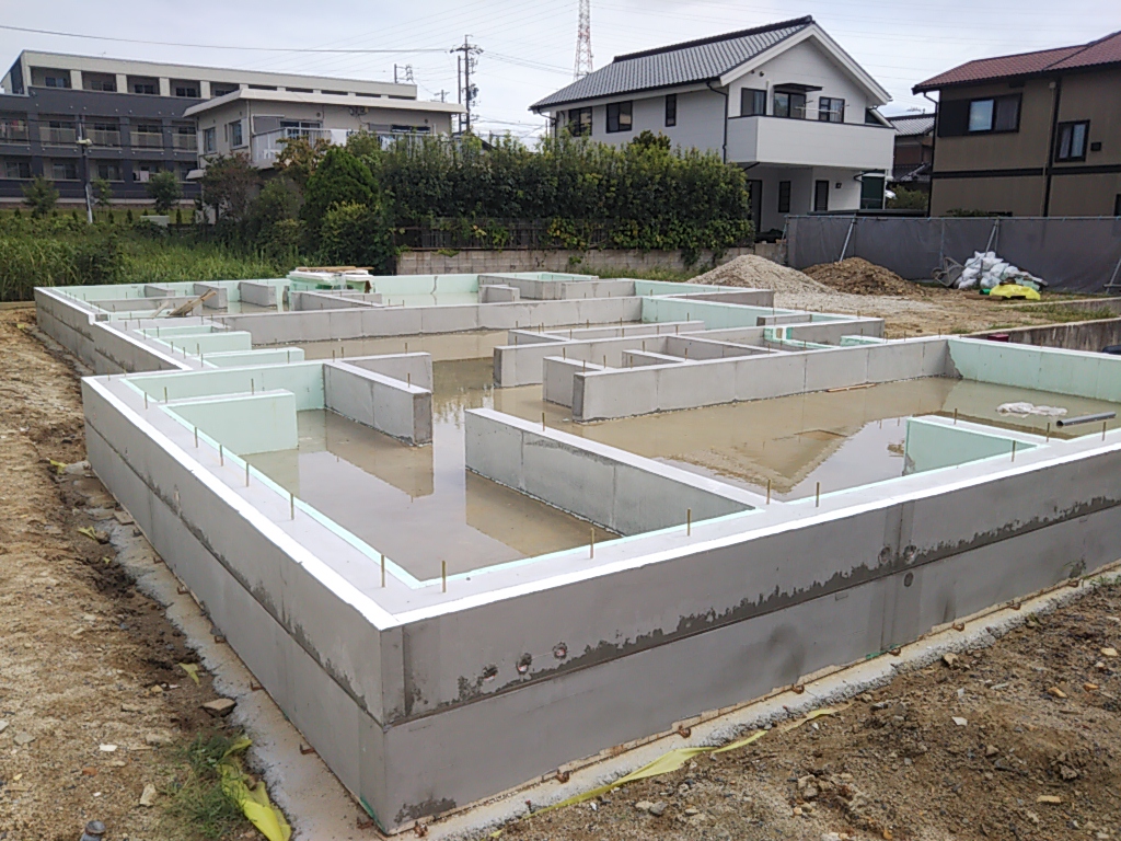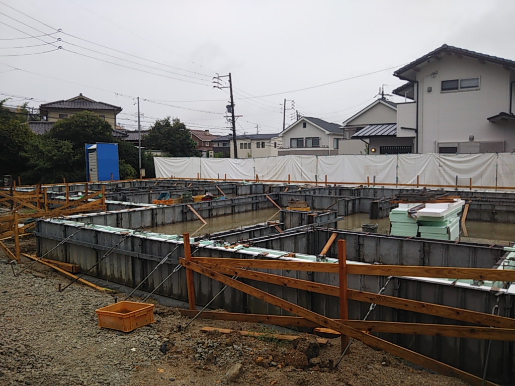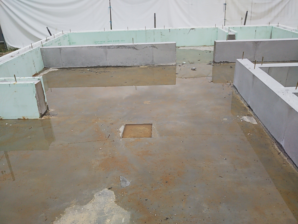 ベースコンクリート打設が終わり、立上りの分の型枠と断熱材が組まれました。そこへ台風による大雨で型枠の内側はプール状態。打設後のコンクリートにとっては水中養生となるのであながち悪い事ではありませんが、作業の妨げになりますので、ポンプによって排出します。