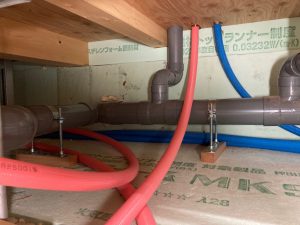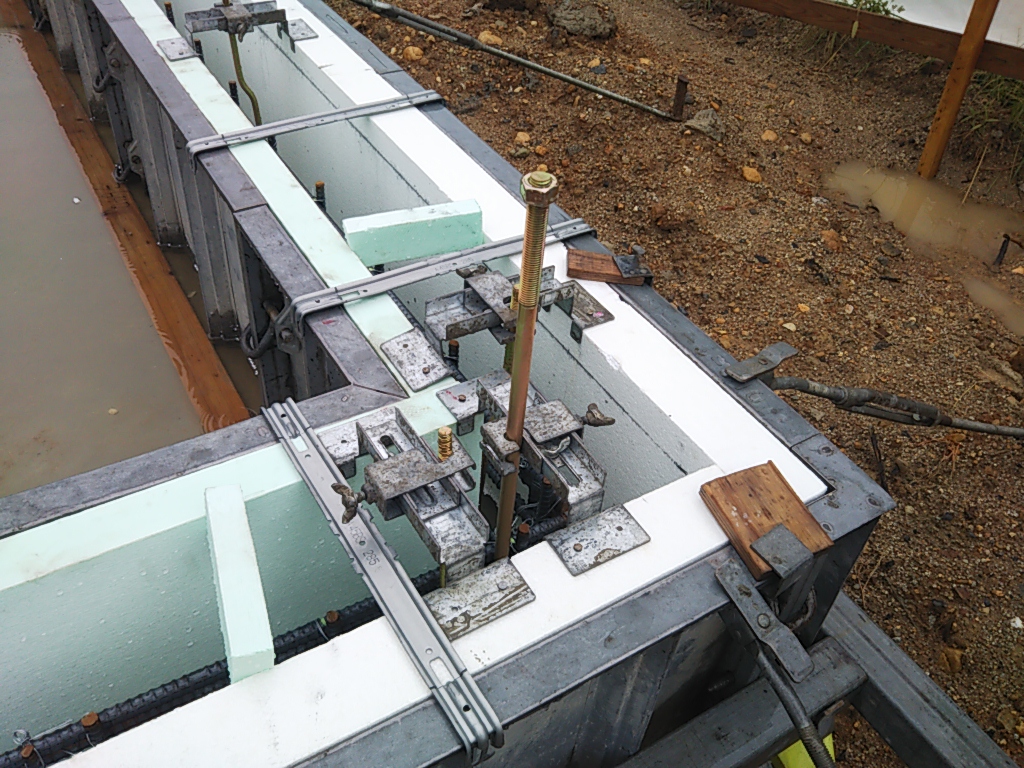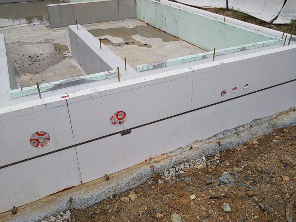外側の断熱材を敷設する際に高さの中間あたりに水平のステンレス板の部材を仕込んでおきます。ステンレス板の幅は断熱材の厚みより1㎝長く、コンクリートを打設した際に1㎝コンクリートの中に埋め込まれることになります。この事により、外部の断熱材の内側を白蟻が上ってきても、ステンレス板より上には行く事ができない、というネズミ返しならぬ『白蟻返し』の効果を持つ部品です。また、上2段の写真には給排水管の穴も先行して配置しており(断熱材のところどころに丸いオレンジのテープが見えます)、必ずシロアリストッパーの上で開孔しています。万一配管の外側を伝ってきても蟻道は丸見えですので、如何様にも対処できる、という工法です。