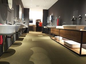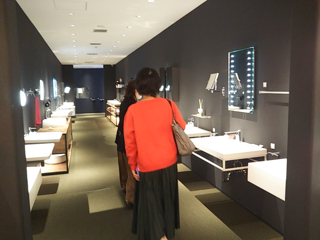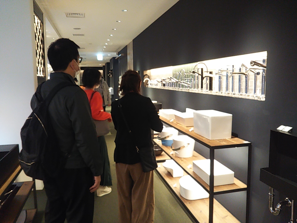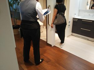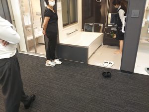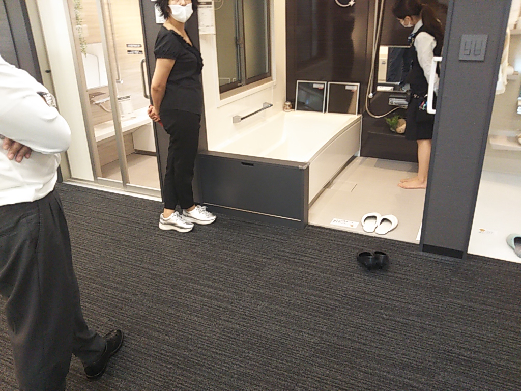 設備の体感やカラー仕様決めのためショールームへやってきました。百聞は一見に如かず、浴槽にも実際に浸かってみて大きさなどを実感していただきます。