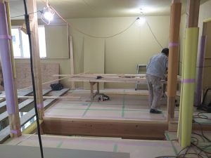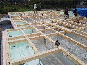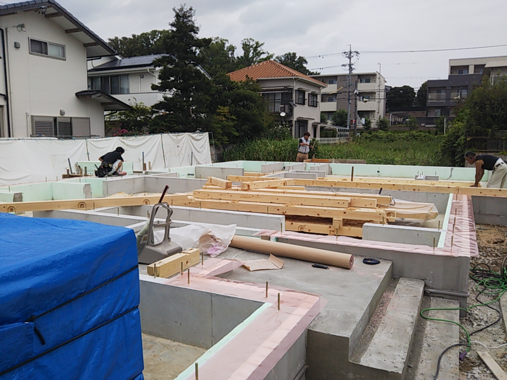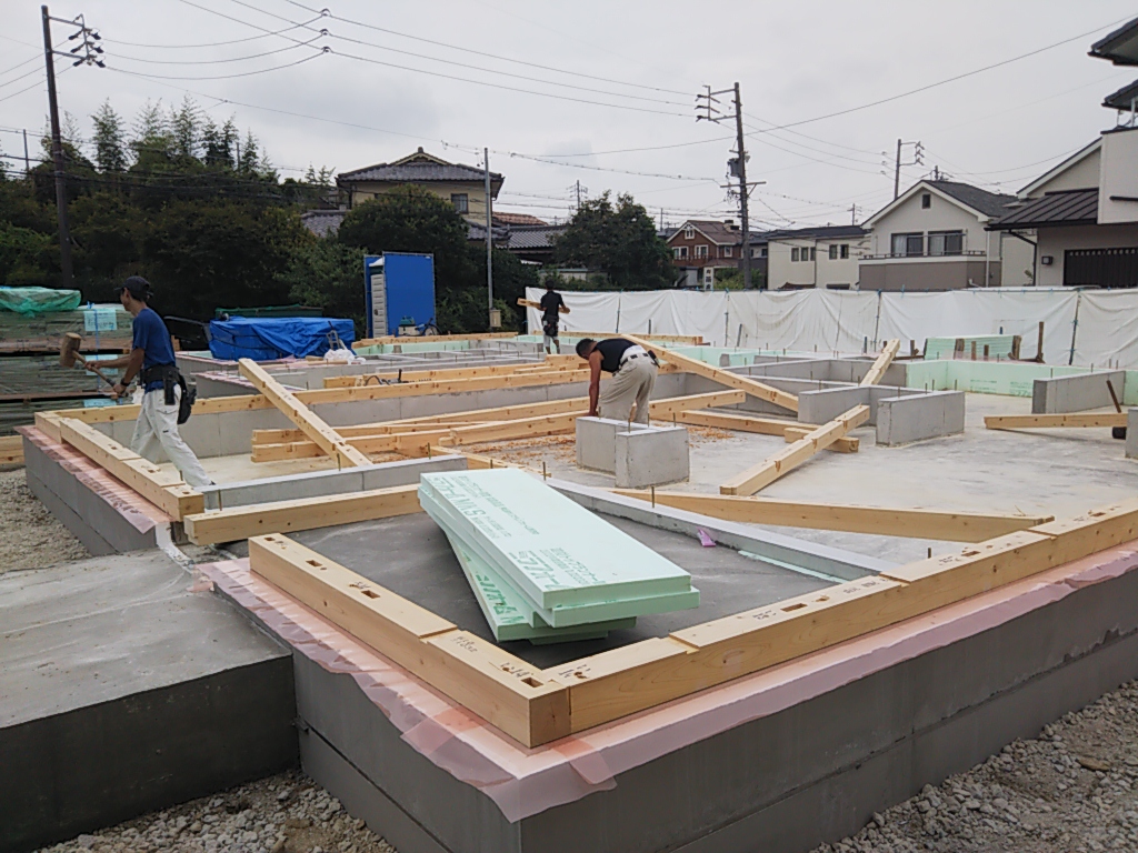 基礎内側底面の断熱材も布設、大引もだいたい敷き終え土台伏工事初日は終了です。