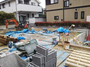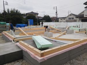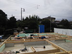 土台伏工事が始まりました。時折ぽつぽつと小雨がパラつく時もありますが何とか天気も持ってくれているようです。