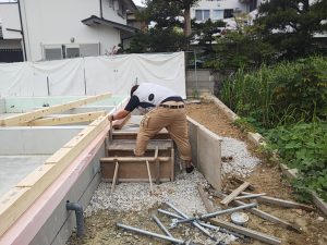着々と桧材の土台が据えられる片隅で現場監督K谷君は出入り口にあたる部分に基礎とは別にコンクリートで作られた外部階段の型枠を外しにかかります。職人仕事を手伝っておりご苦労様です。かく言う筆者も右手にカメラ、左手にハンマー、腰には作業袋を下げ、解体を手伝っています。このY様邸、普段の現場より大きいので、このような外部階段だけで5か所あり、通常の倍以上の時間がかかります。職人を手伝うK谷君を手伝い、久々に現場で汗を流す充実感、とは言え記録用の写真を撮っていないと自分の本来の仕事を忘れそうになるところです。