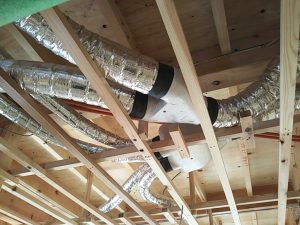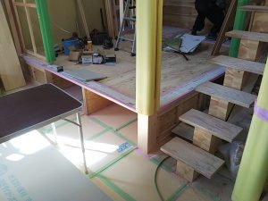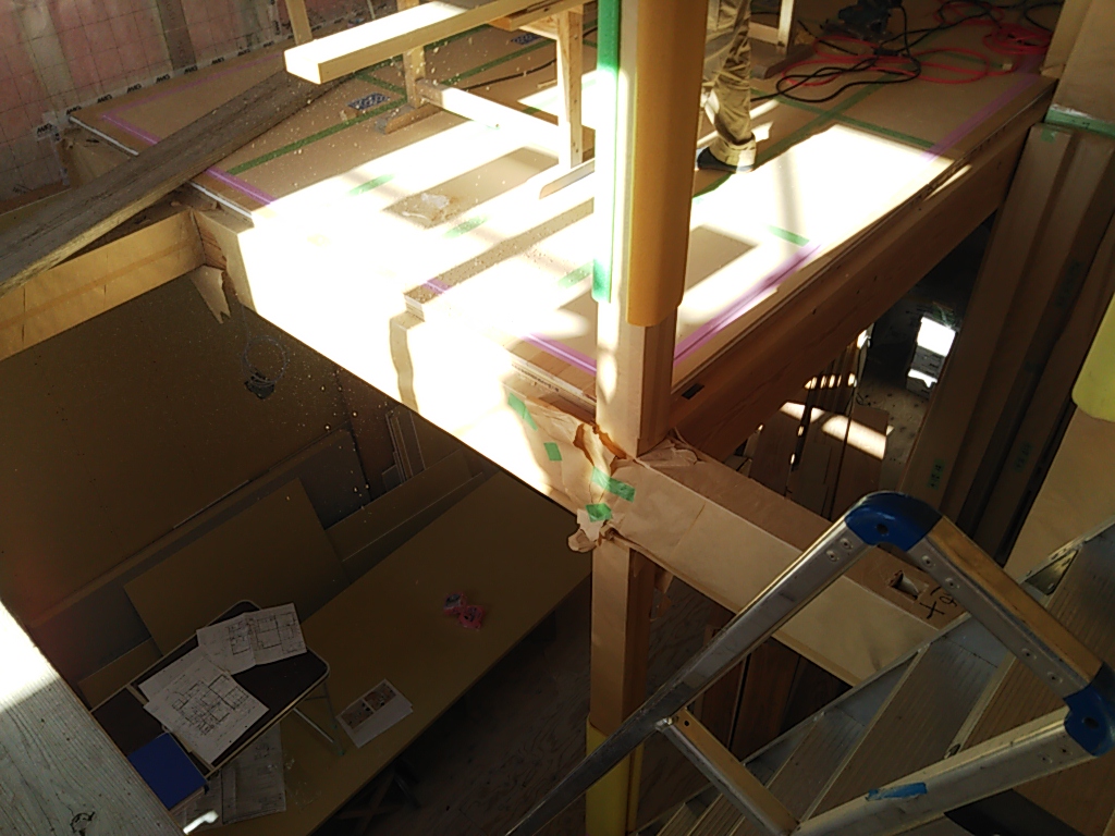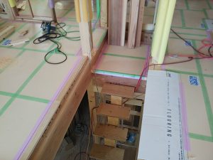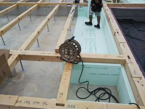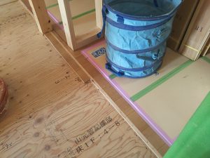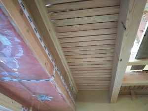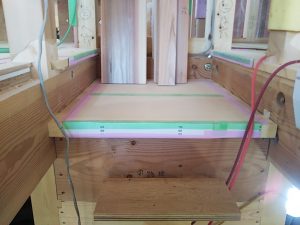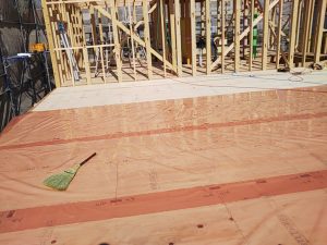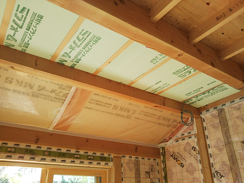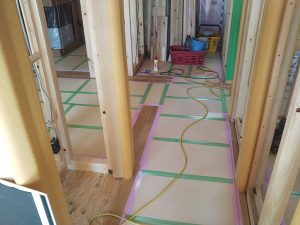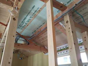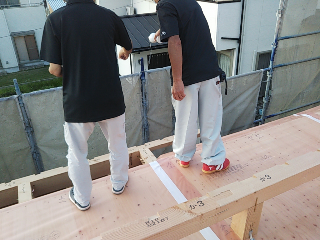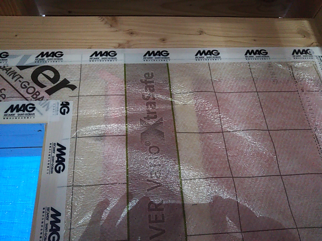 今回は天井断熱の形式ですので、水平構面とする梁上の合板の上に気密シートを敷き詰め、この部分を断熱気密層とします。屋根裏の空間になり、屋根下地を伏せてしまってからでは施工が困難なため、上棟時に敷設をしておきます。