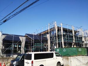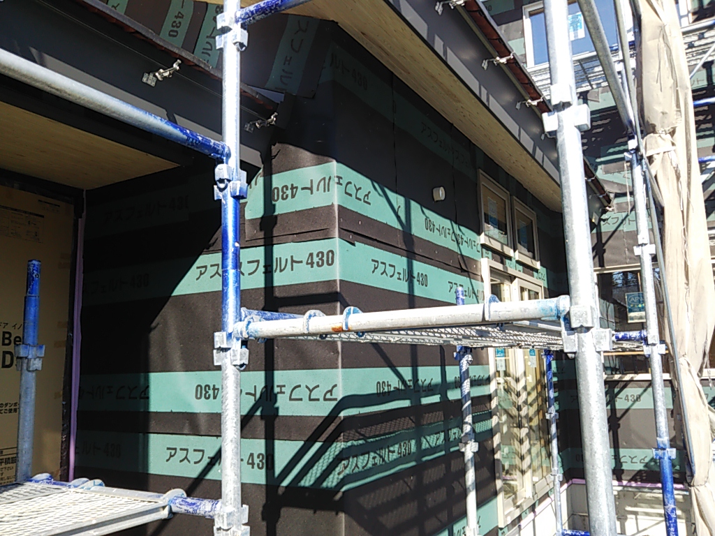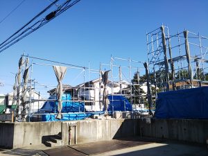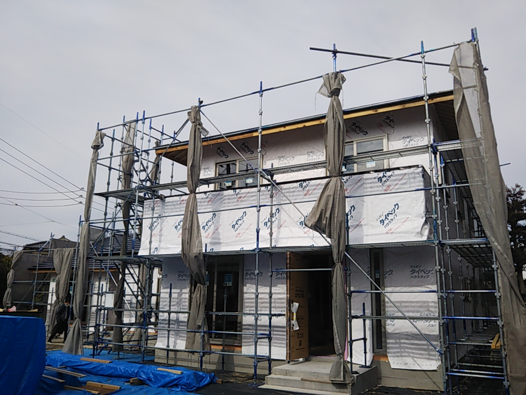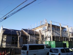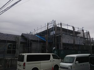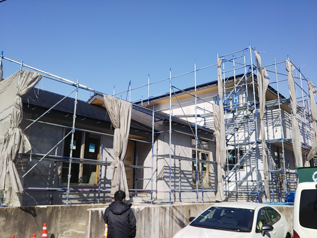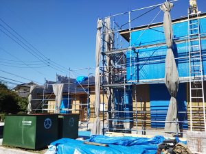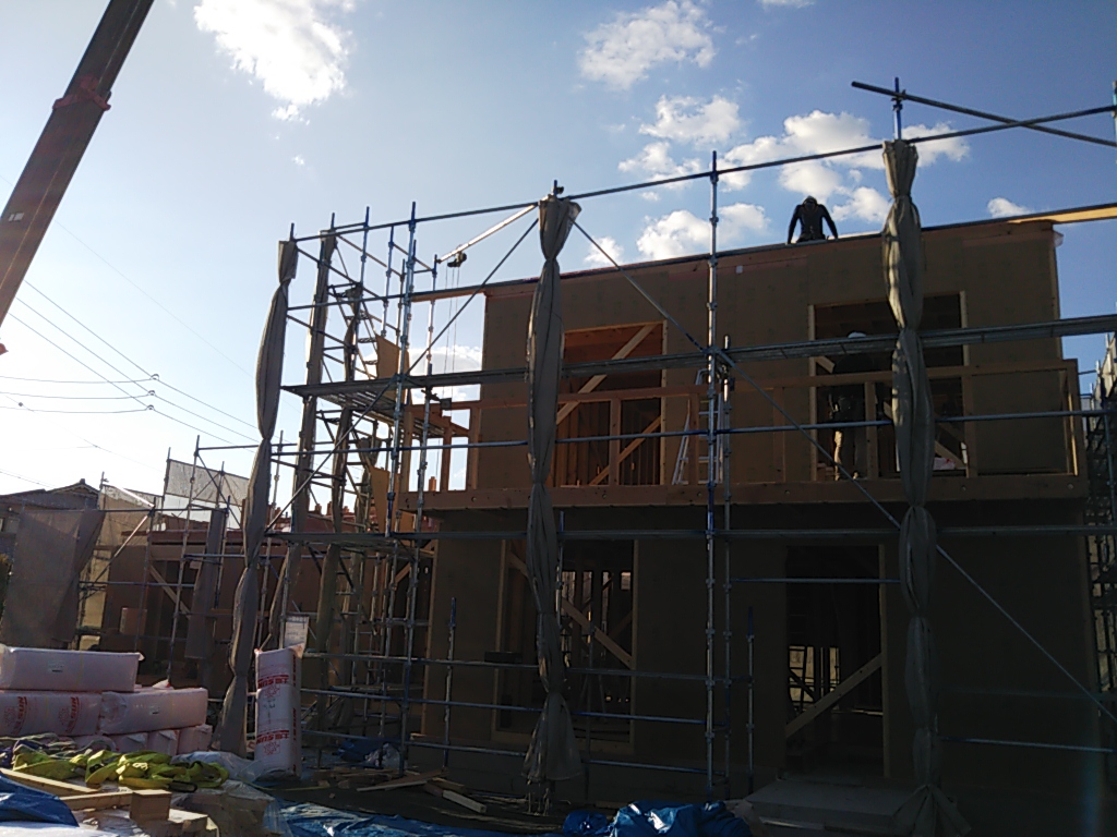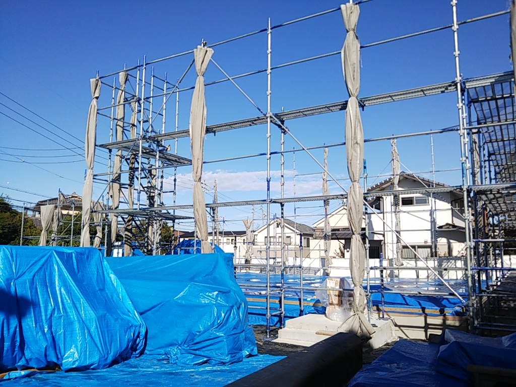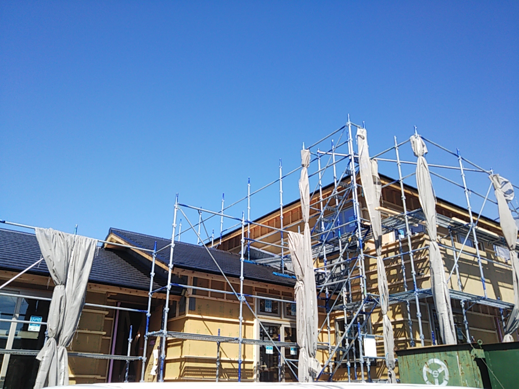 先行して鋼管足場がかかりました。いよいよ明日から上棟です。大きい建物になりますので、上棟の作業も2日がかりです。この分だと明日明後日の天気は心配なさそうです。準備万端抜かりなく。