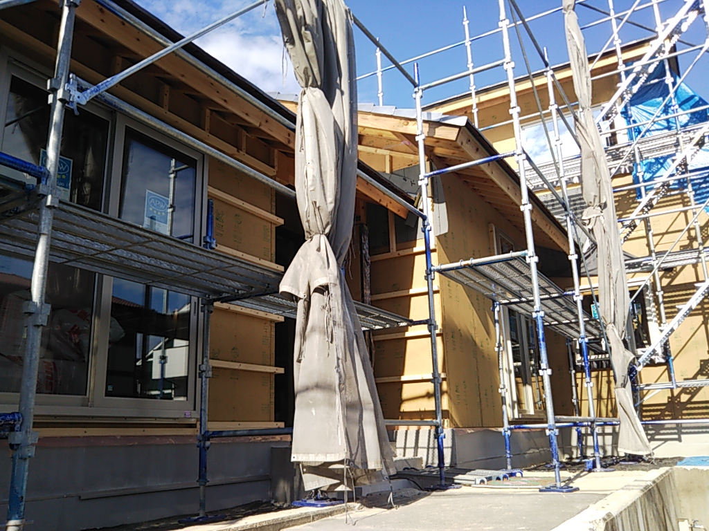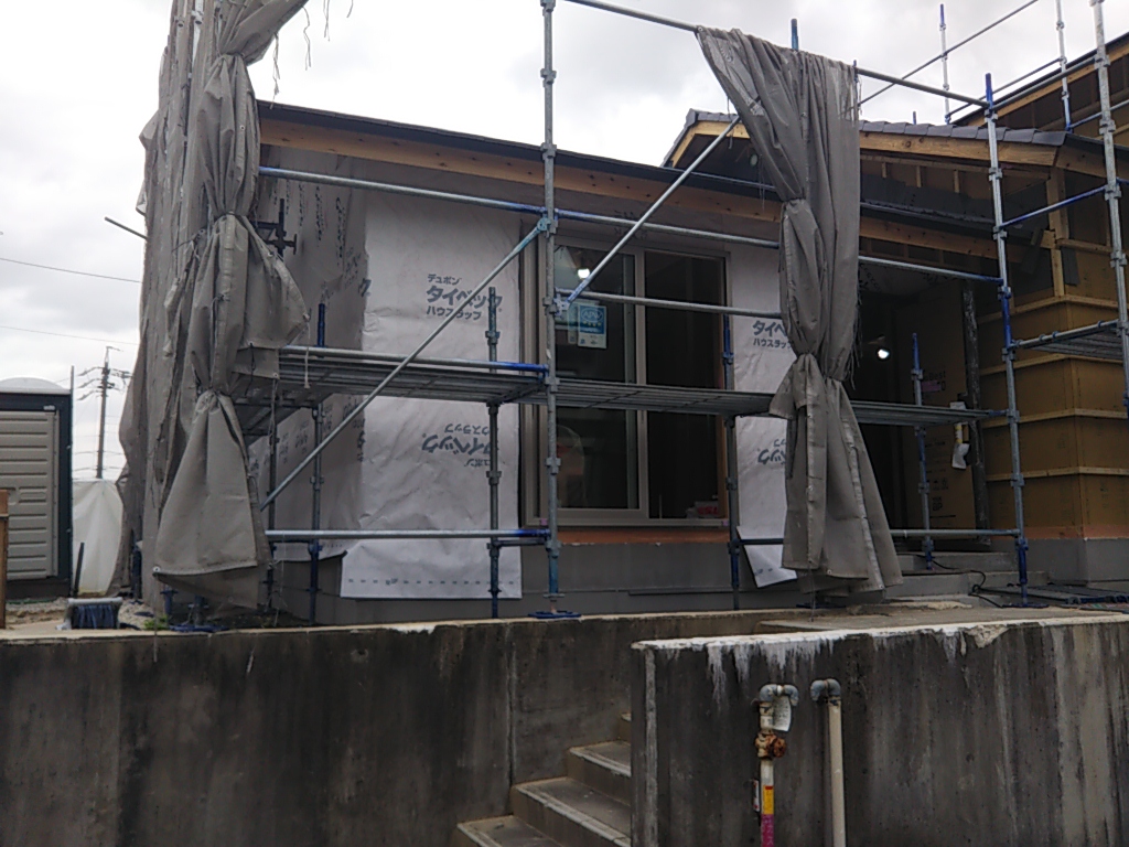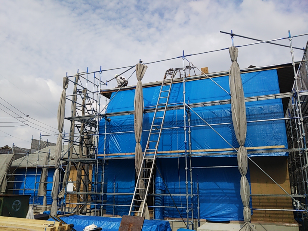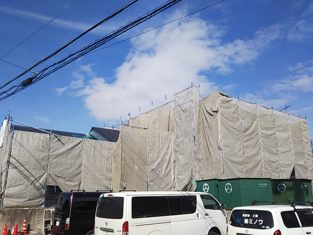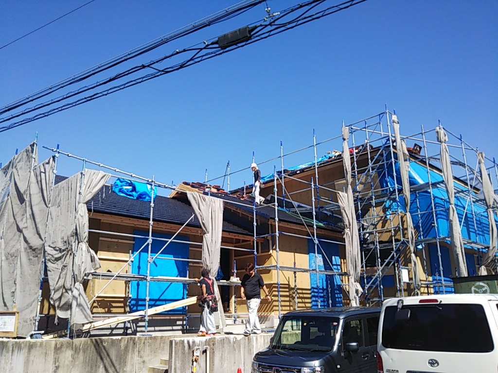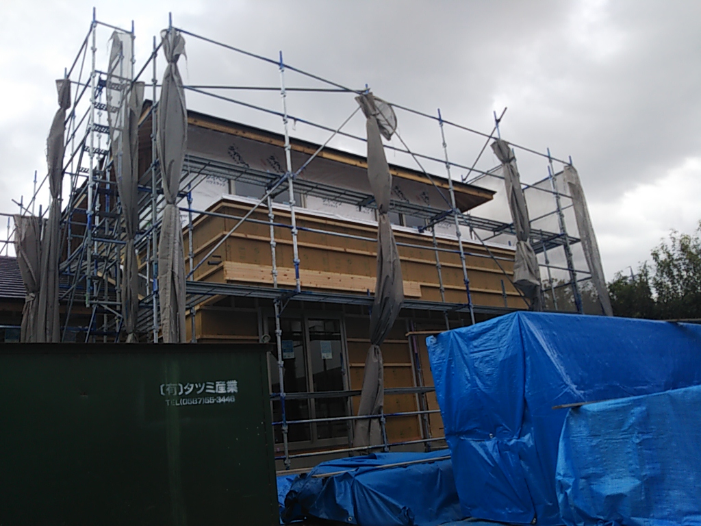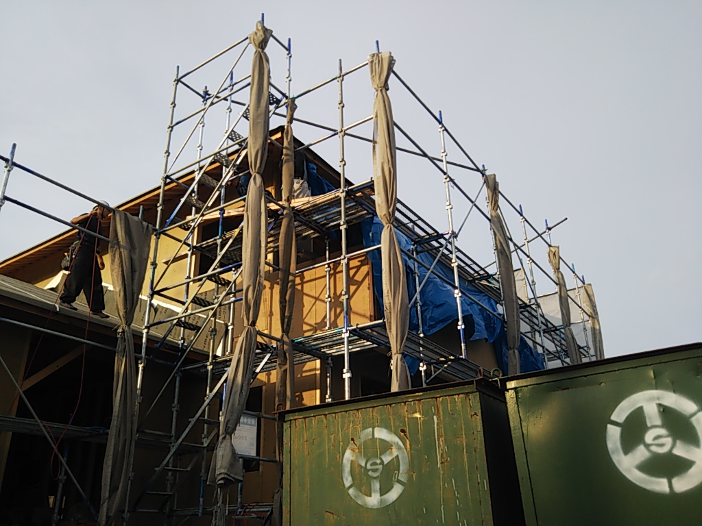 台風も台風で天気予報では列島直撃と思いきや太平洋側へそれていく始末です。先週末大慌てで足場のシートをたたみ、強風に備えましたが、長雨が降るばかりで拍子抜けです。(現場としては風が吹くよりはありがたいのですが)本日は残暑の中めくったシートを元通りにする作業です。