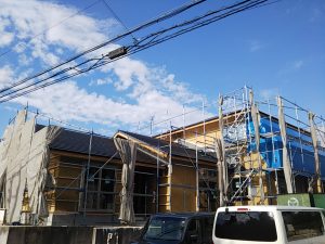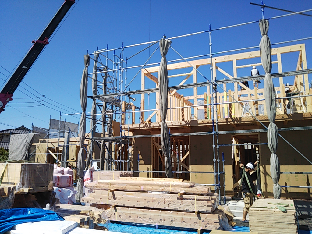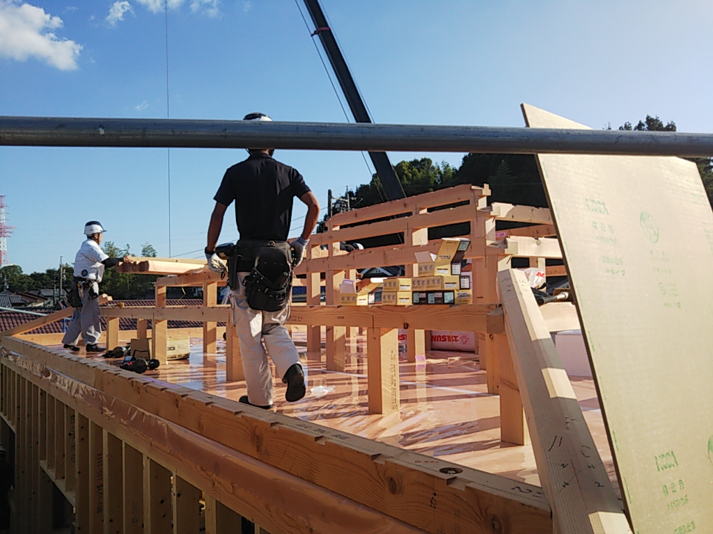 朝は秋の寒さ、昼には残暑の暑さが残る中、快晴に恵まれた本日、建方が始まりました。建物本体が大きいため、応援の大工さんの人数もたくさんです。
