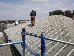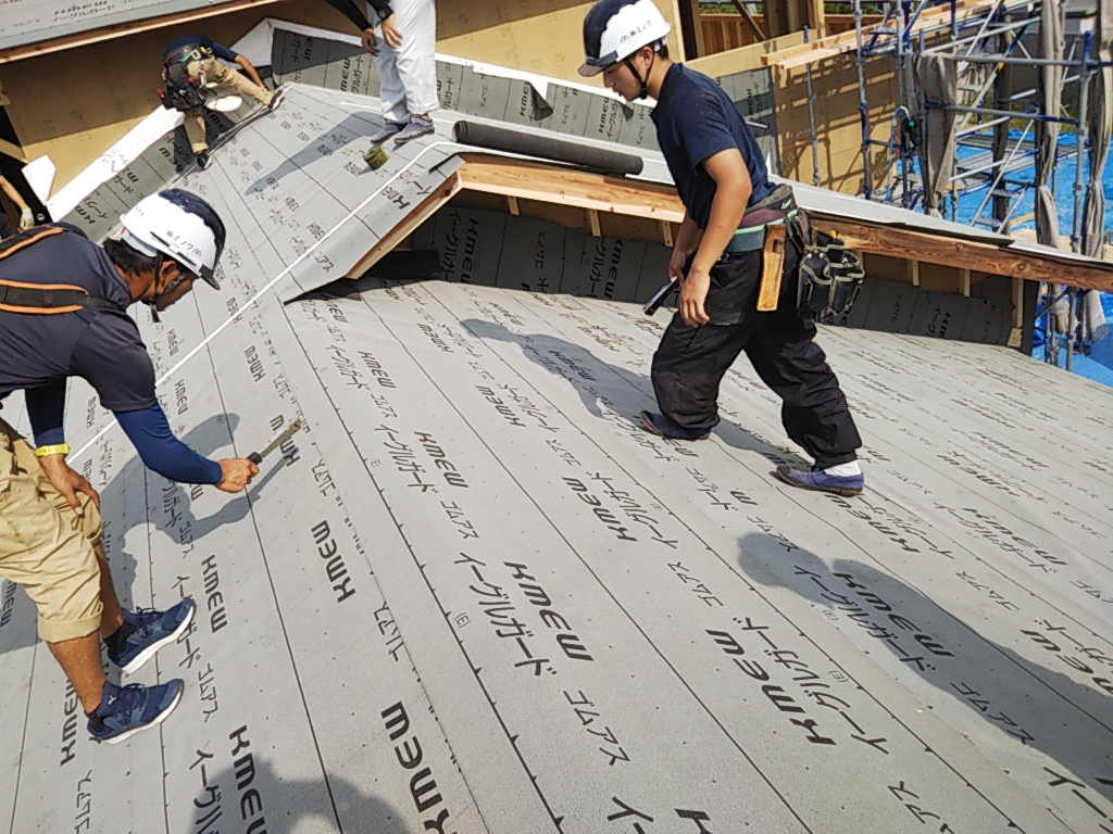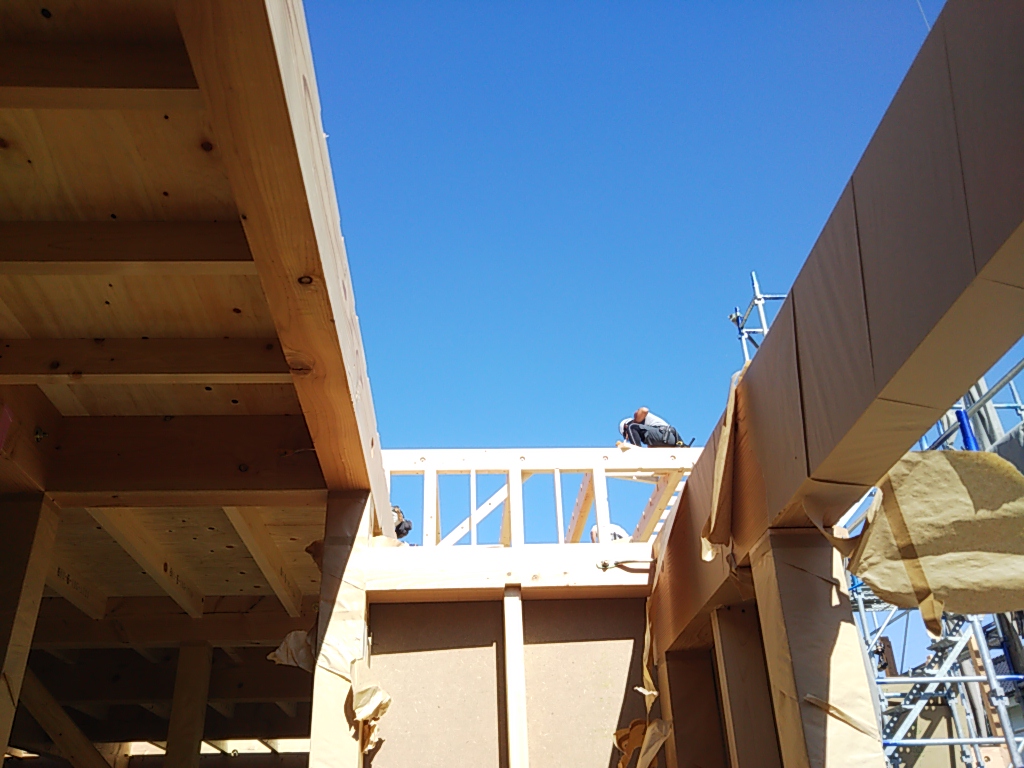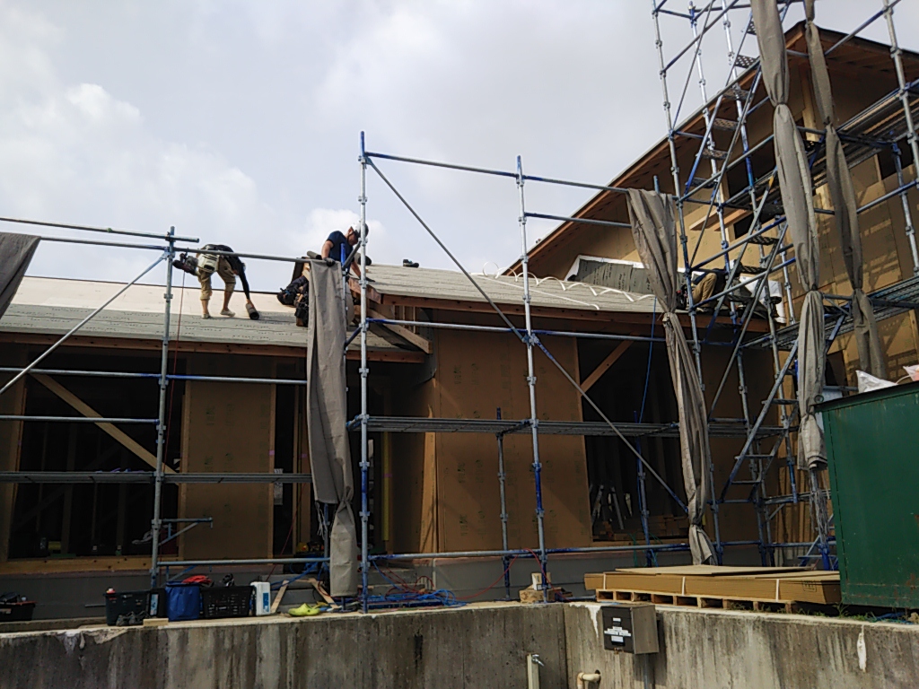 上棟二日目。先日タイムアップで終了した屋根下地の続きから始めて、防水下地ルーフィングが敷設されました。屋根勾配は4.5/10、上に立つと結構バランス感覚が必要です。