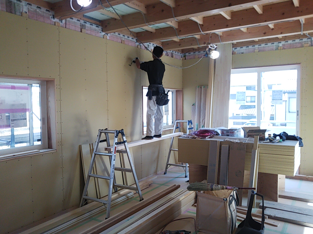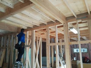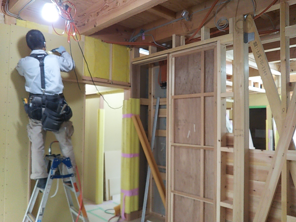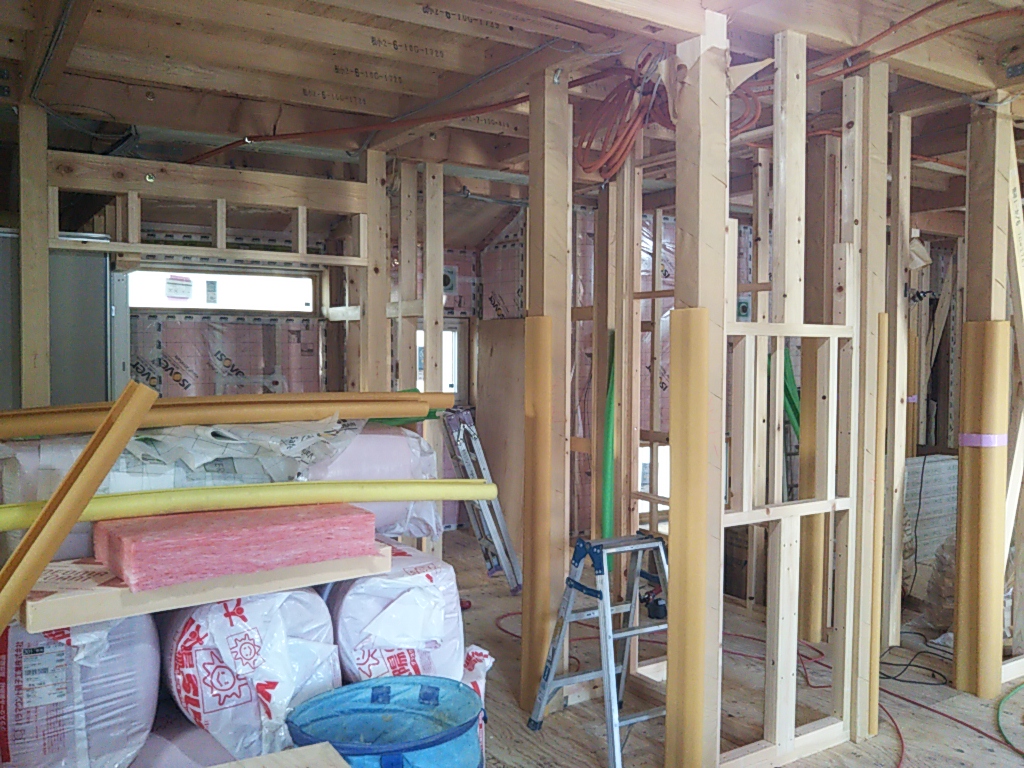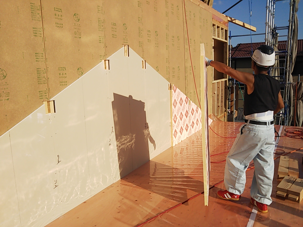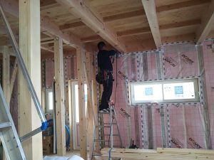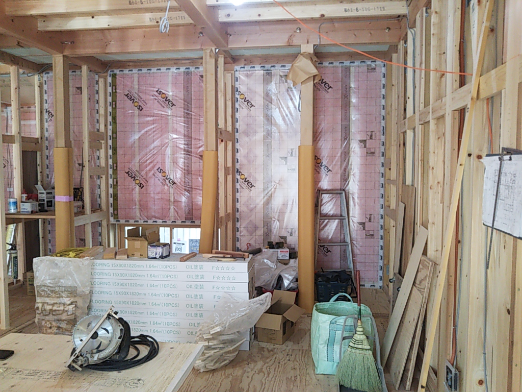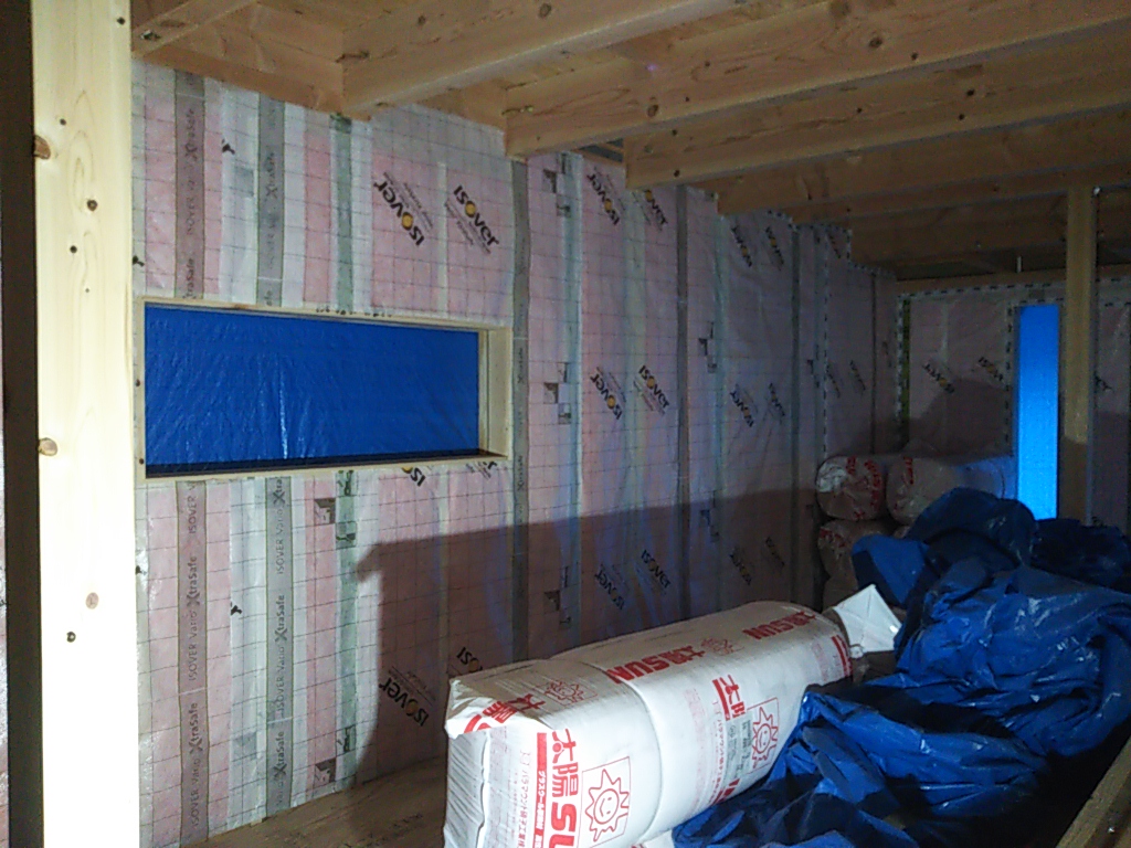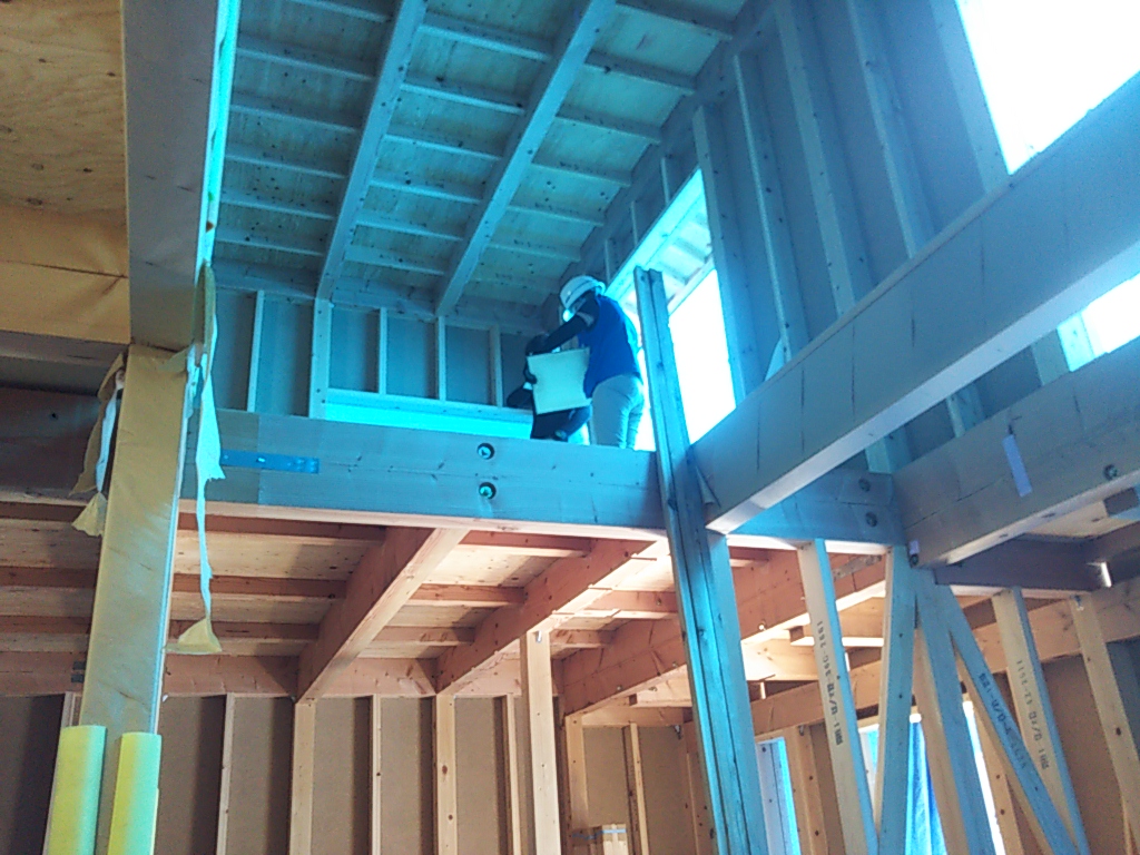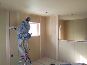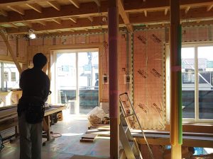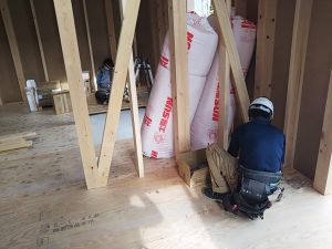 室内の柱間に断熱材として高性能グラスウールを敷設していきます。そのうえで気密シートを張り、高気密高断熱仕様の外壁ができ上っていきます。