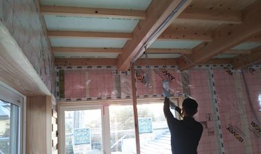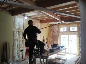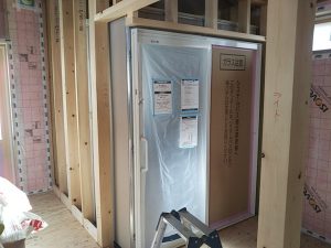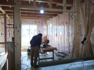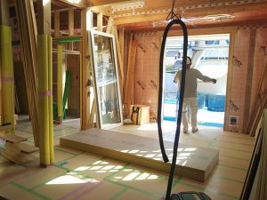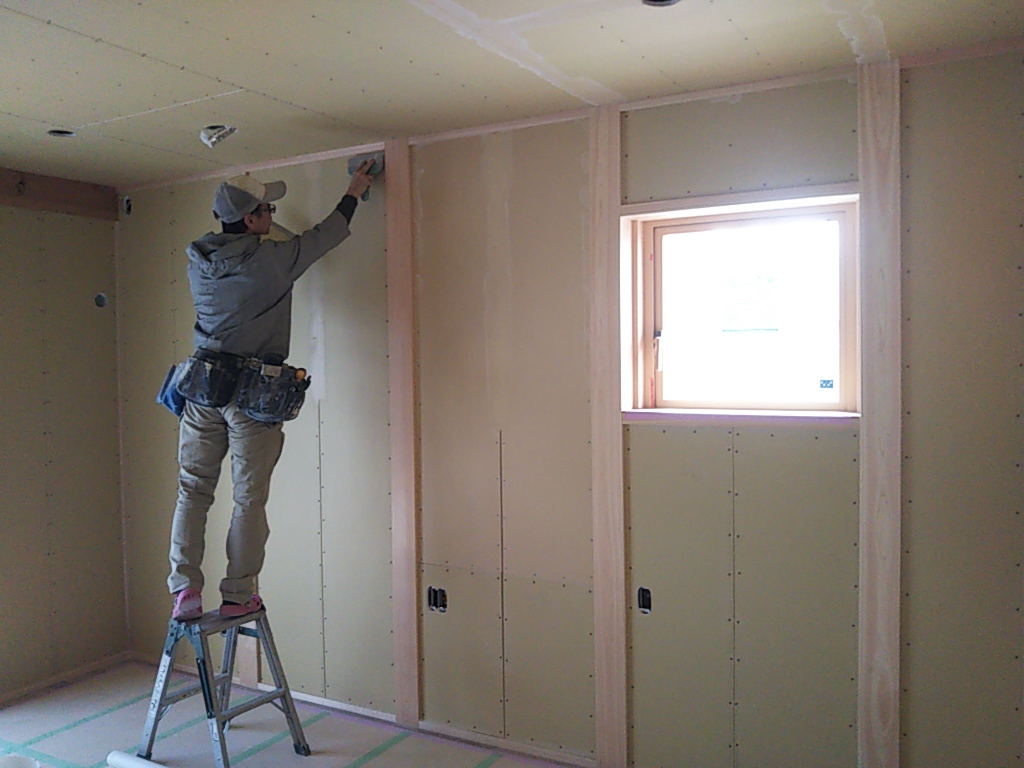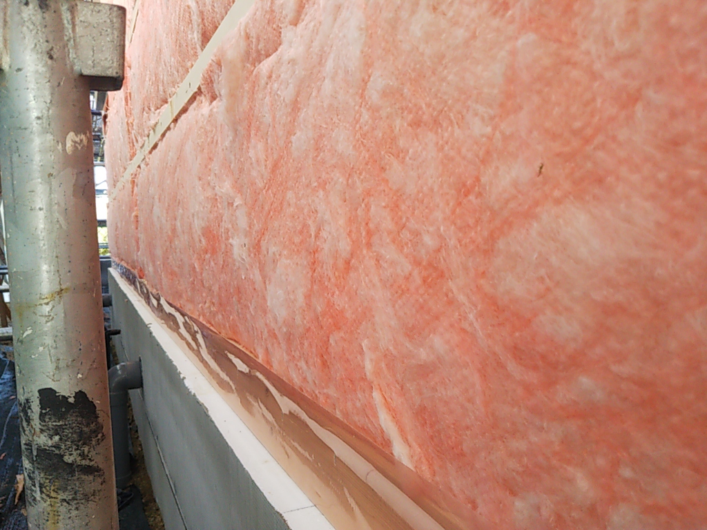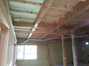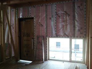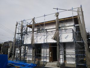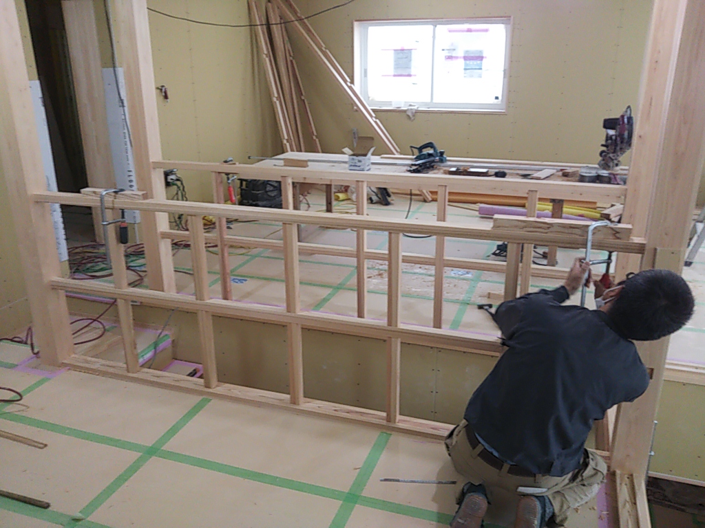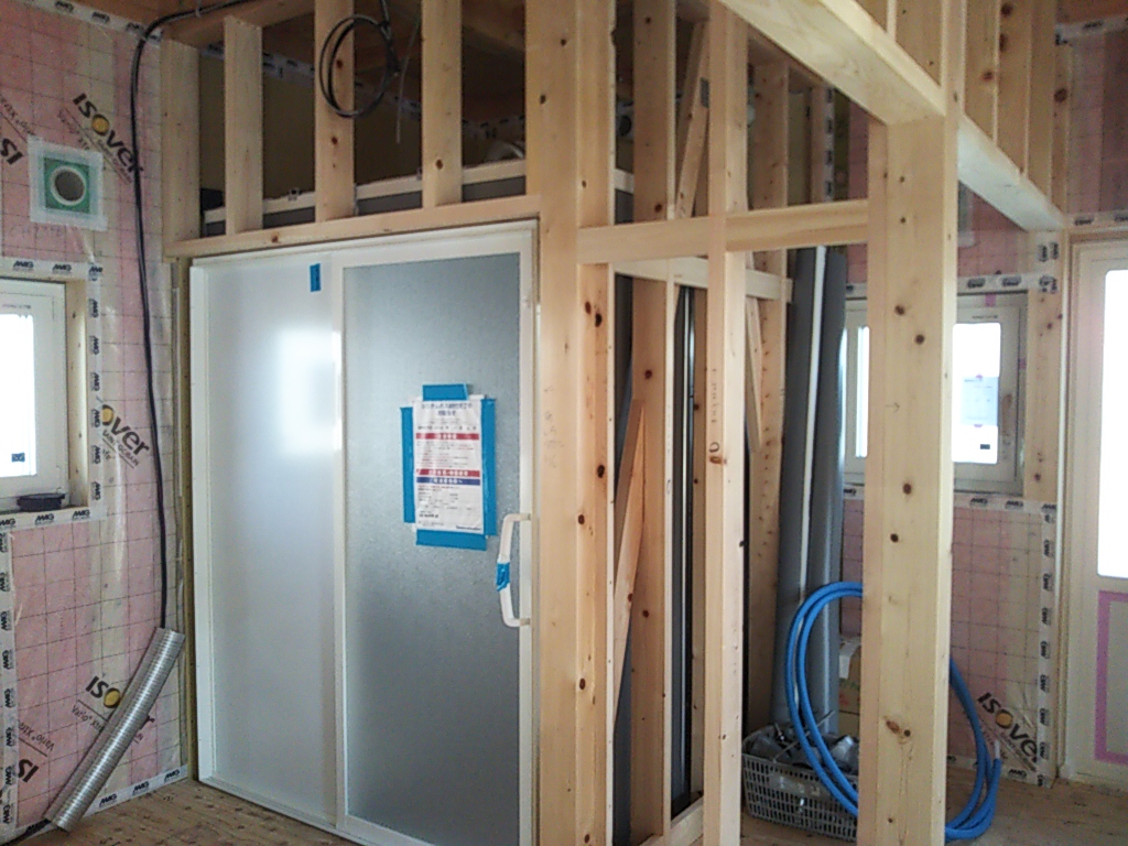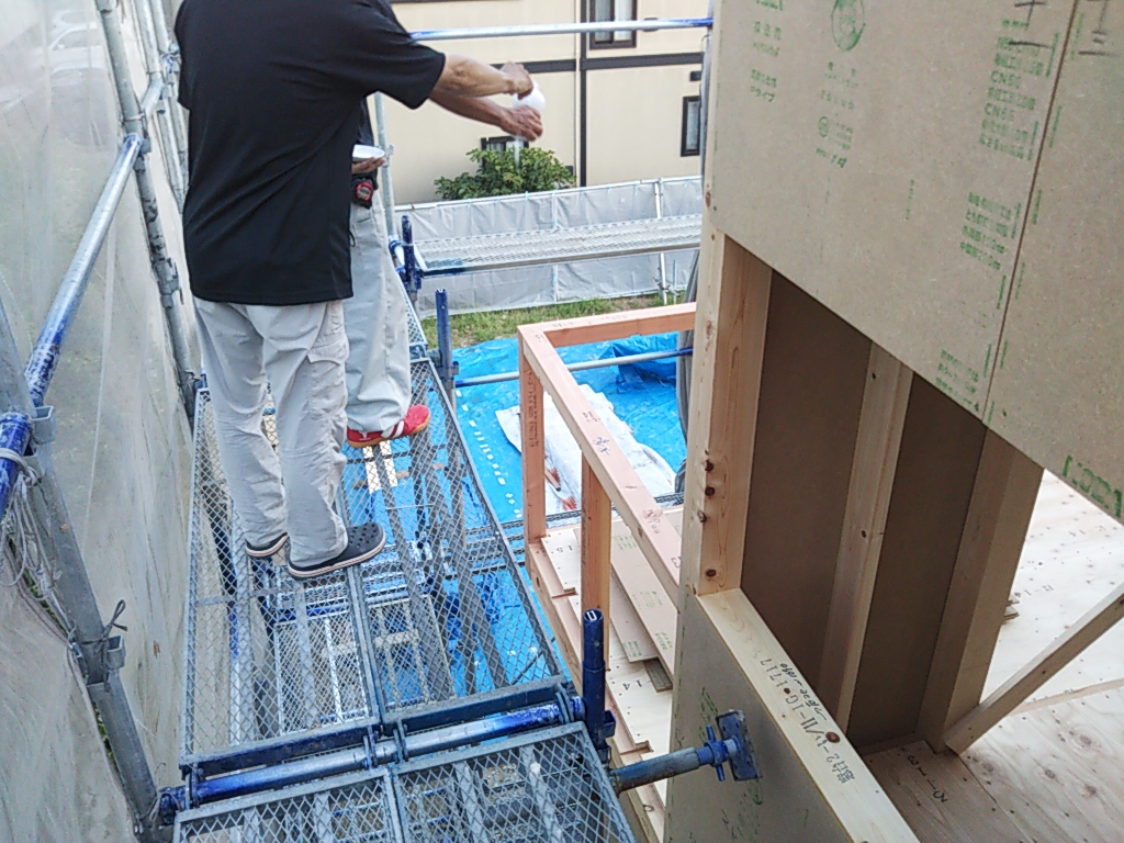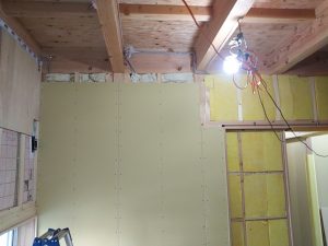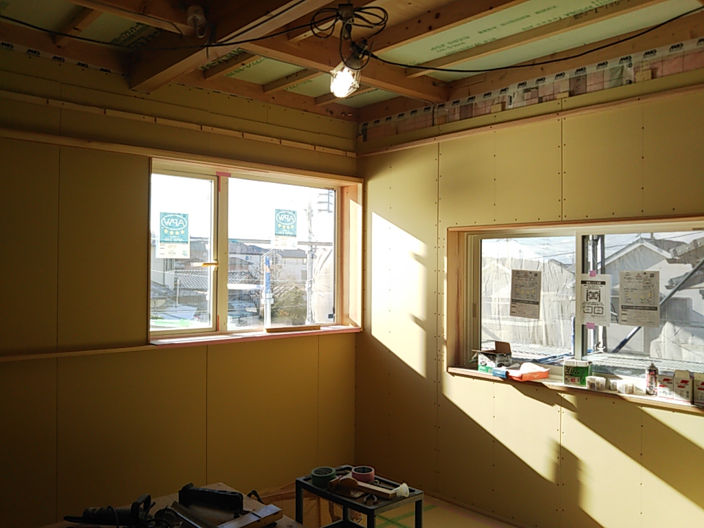室内の柱間に断熱材として高性能グラスウールを敷設していきます。そのうえで気密シートを張り、高気密高断熱仕様の外壁ができ上っていきます。