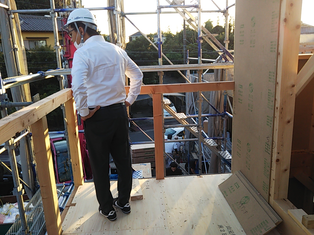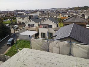 久しぶりに行う筆者独自の上棟の儀式。屋根の一番高いところに立って遠くの方まで眺めるとその先には名古屋市の街並みが遠々と広がっています。