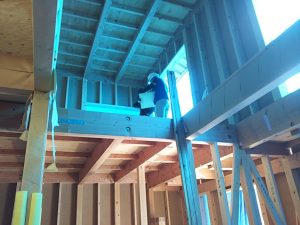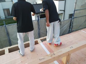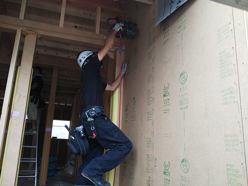 屋根下地までが終わり、雨仕舞がある程度できた後は建築金物の取り付けに入ります。地震や暴風などで建物に水平の外力がかかった際、柱が土台から抜けないように留め付ける金物を全部の柱に取付けます。10人からの大工さんが面材によって閉じられた空間で一斉に電動工具で作業をしますので、絵面は非常に地味ながら棟上げ作業の中で一番派手な音が現場内に鳴り響きます。