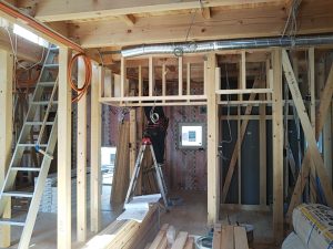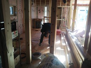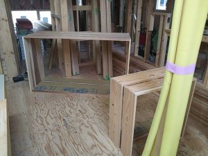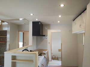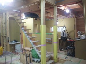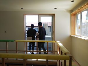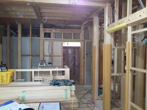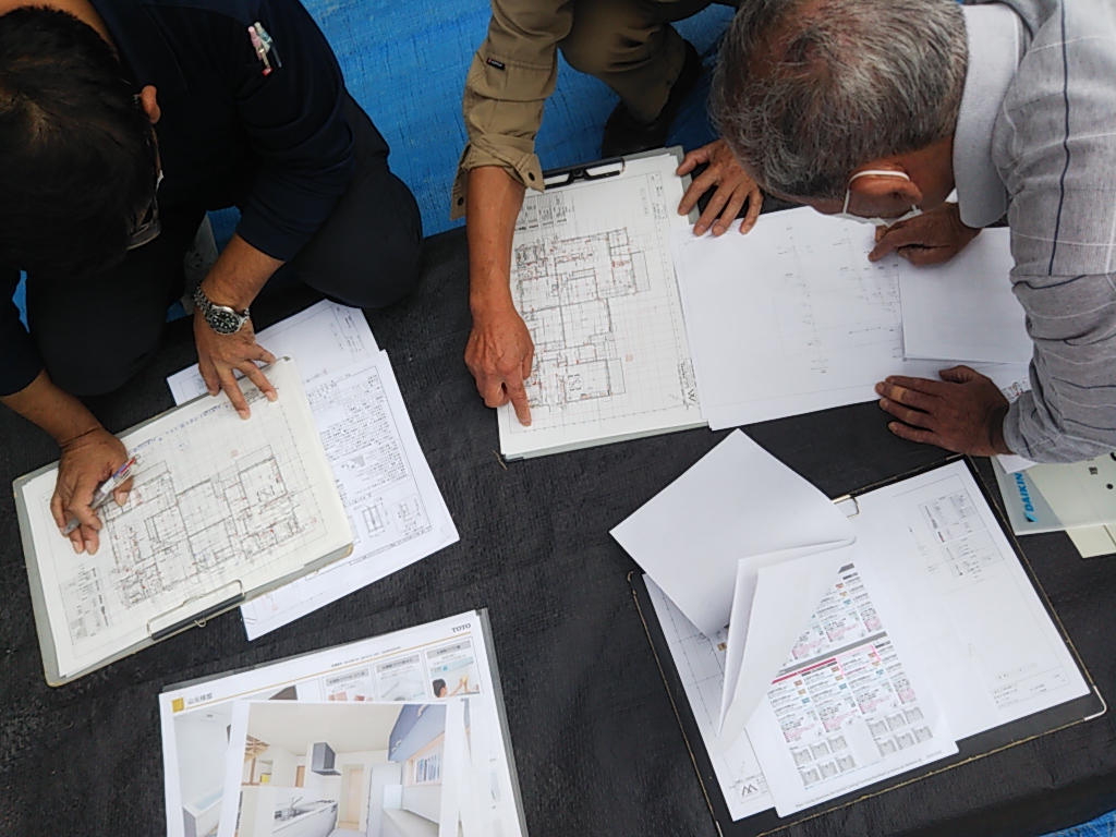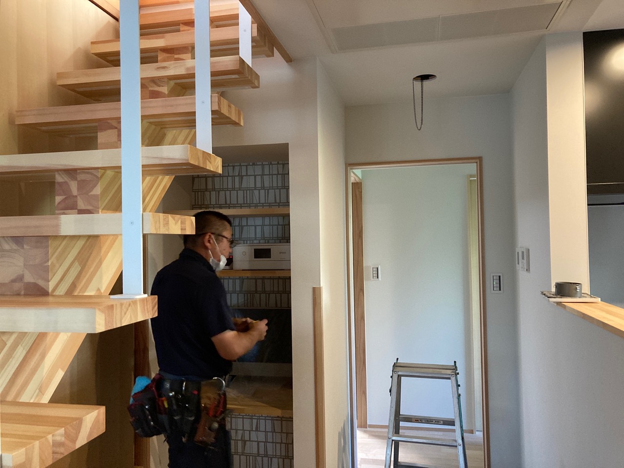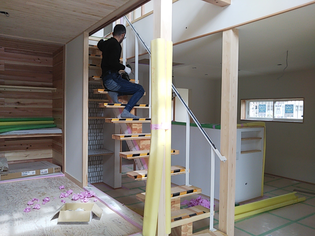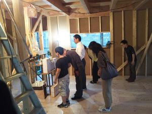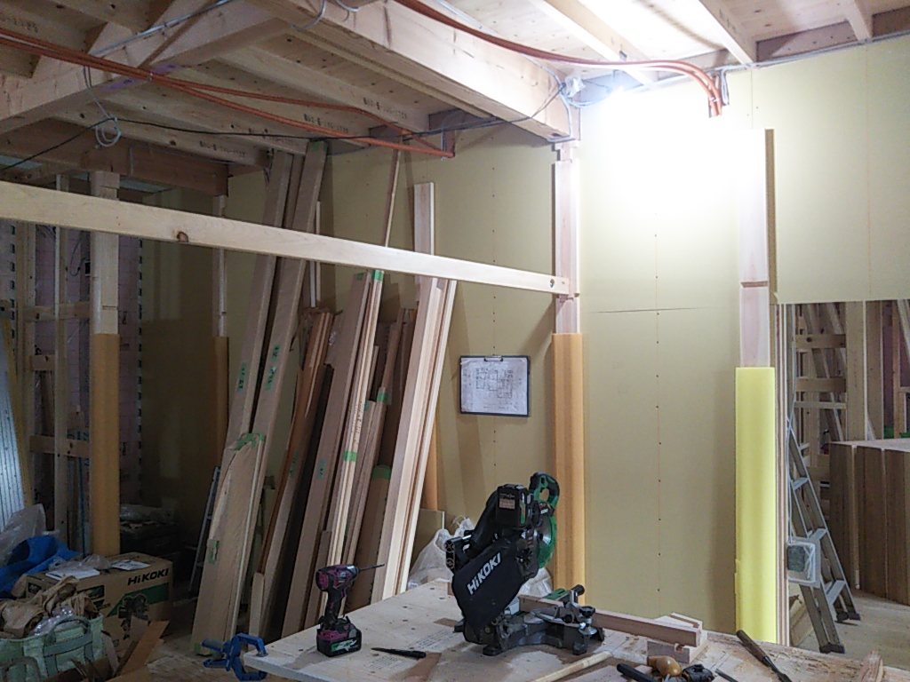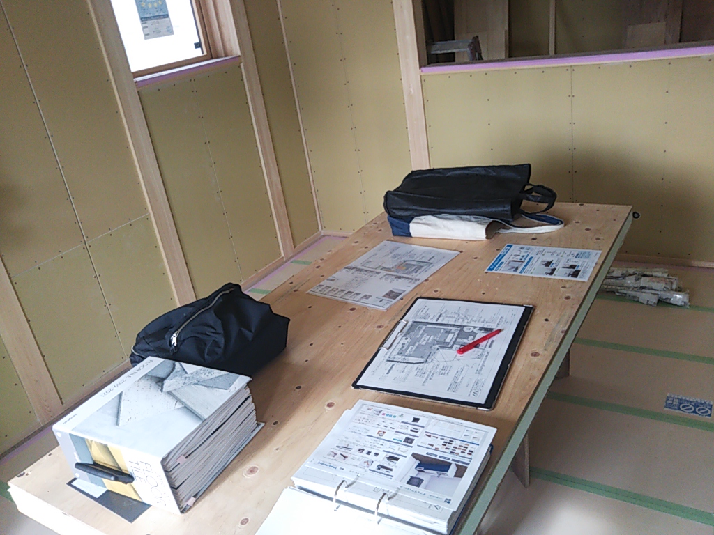 内部では内装造作棚のお打合せです。どの部分にどの大きさの棚が欲しいかをy様に実際に現場に立っていただき検証を進めます。