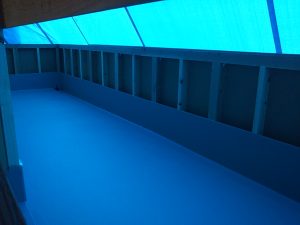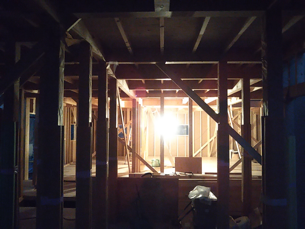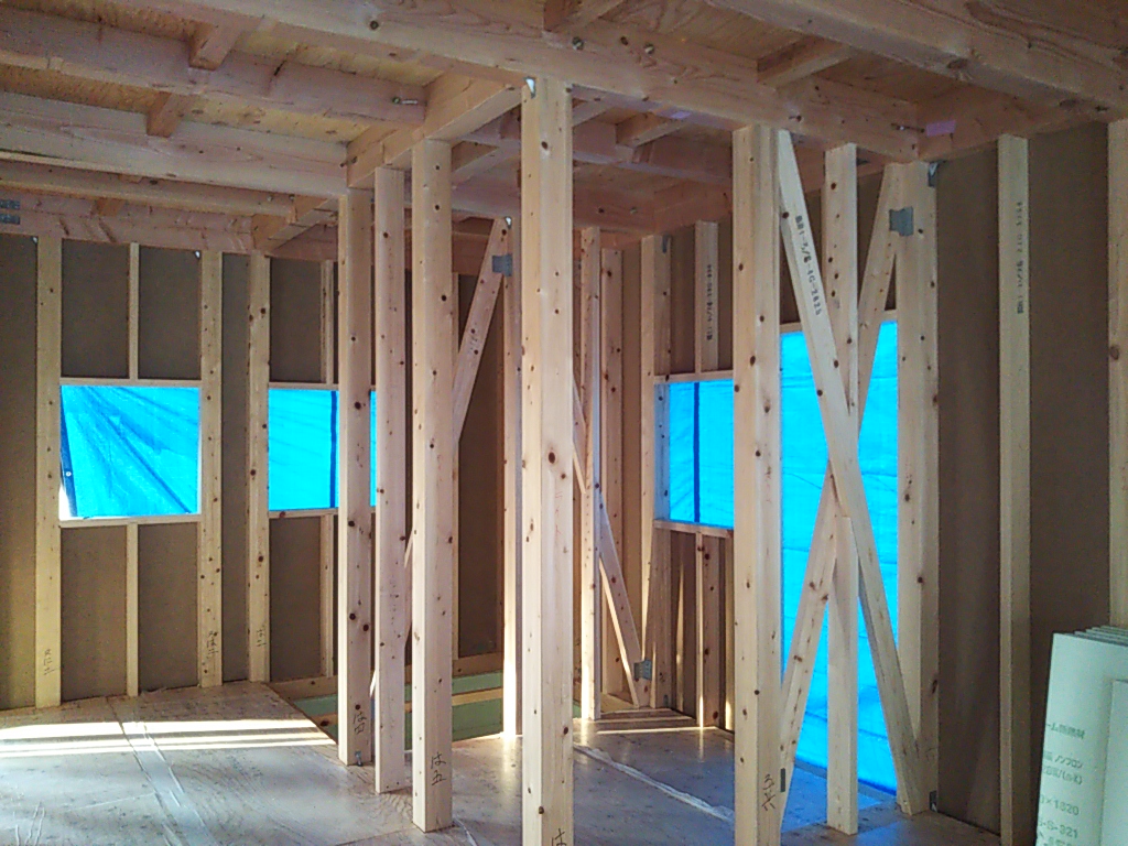 屋根以外の防水下地はこれから施工となりますので、それまでの雨対策として外部をブルーシートで覆います。内部は一転して青の世界。明日からは棟梁一人の作業がコツコツと続いていきます。