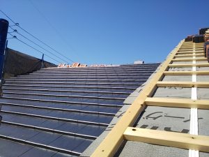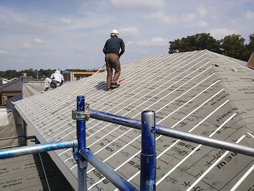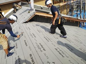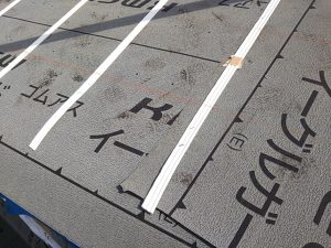 まずは『流水テープ』張りからスタート。屋根の流れる方向に等間隔に張られている白い帯状の物です。瓦を留め付ける下地木材は屋根の流れに対して直交方法(水平方向)に取付けられます。右写真の朱墨の方向に瓦の段数だけ取付けられますが、瓦の下に雨水が入り込んだ場合、ルーフィングの上を伝って屋根の端で雨樋へ排出されなければなりません。その際木材が水平方向に打たれている事によってその部分で雨水を受けて溜まってしまわないよう、この流水テープに被せるように木材を打ち、意図的に小さい隙間を設けます。そこから雨水が下へ流れていく、という役割を果たします。