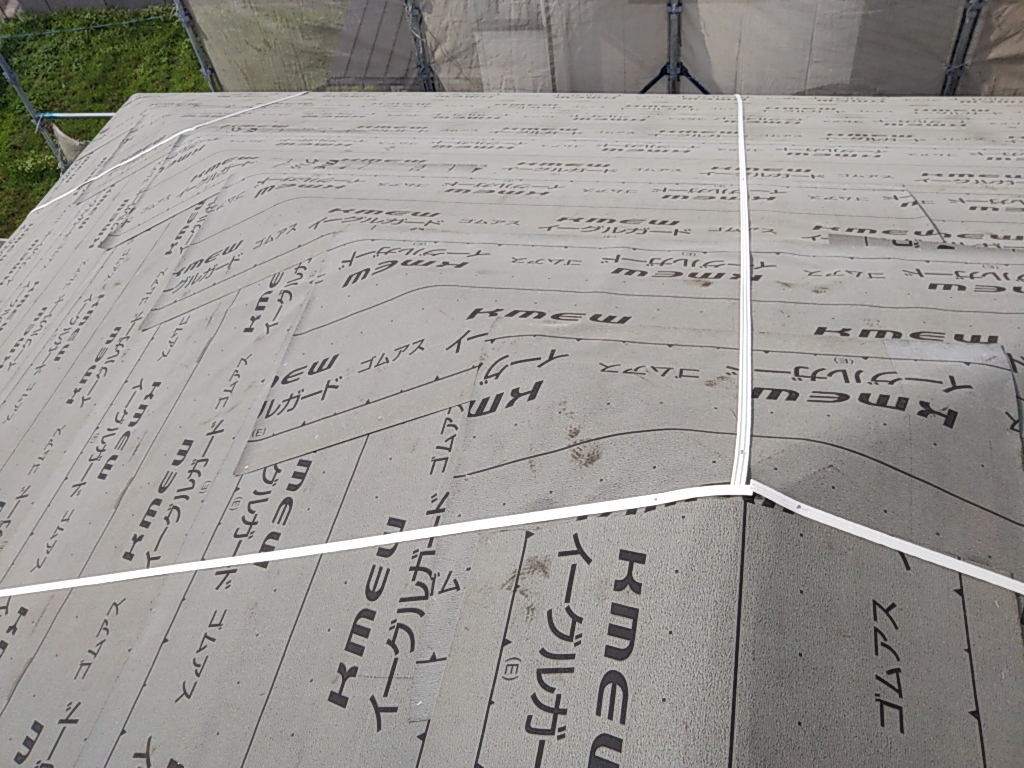 今回は寄棟屋根がありますので、ルーフィングも四方から張りあがってきます。