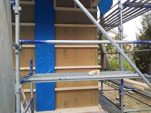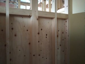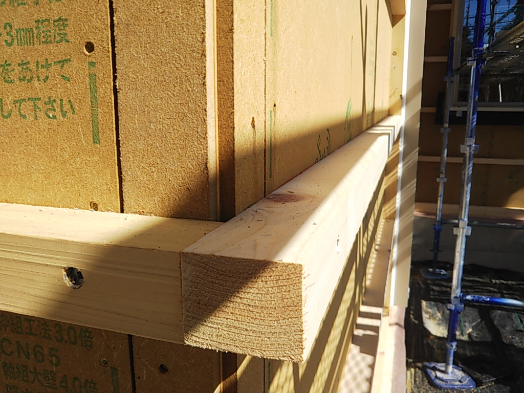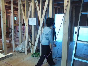 付加断熱材の下地工事。今回は柱間に120㎜の高性能グラスウールを使用し、耐力面材の外側にも55㎜のグラスウールを付加して敷設する計画としているため、断熱材を支える下地を等間隔に打っていきます。
