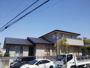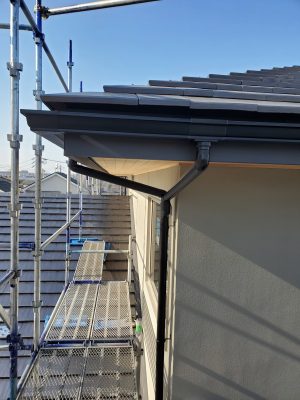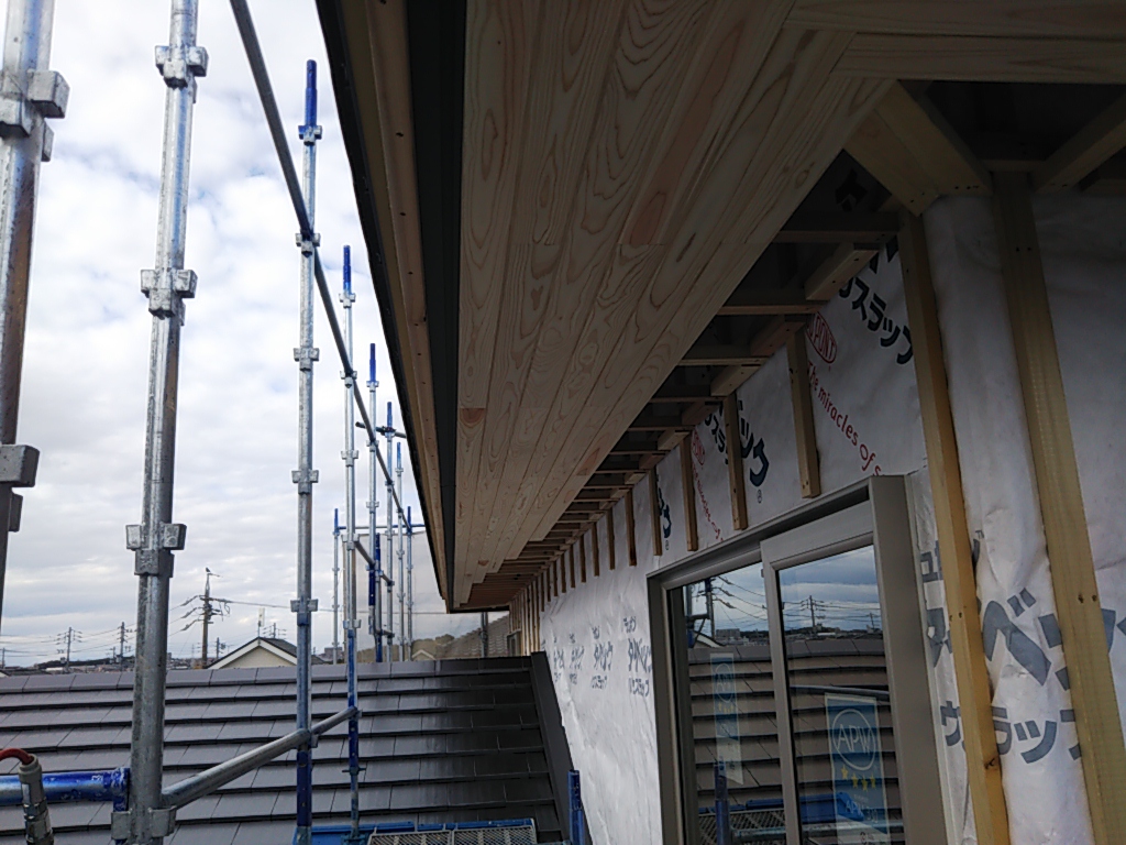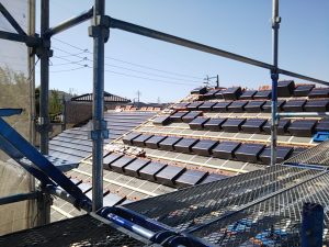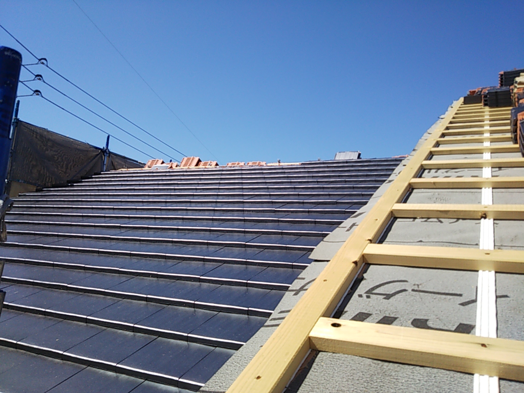 屋根瓦の工事が進んでいます。現場も大きいのでだいたい半分くらい終了したか、という状況です。今回は瓦一枚一枚に凹凸の少ないフラット瓦を採用しました。なるべくすっきり見せたいとのy様のご希望です。