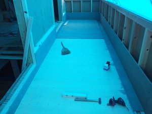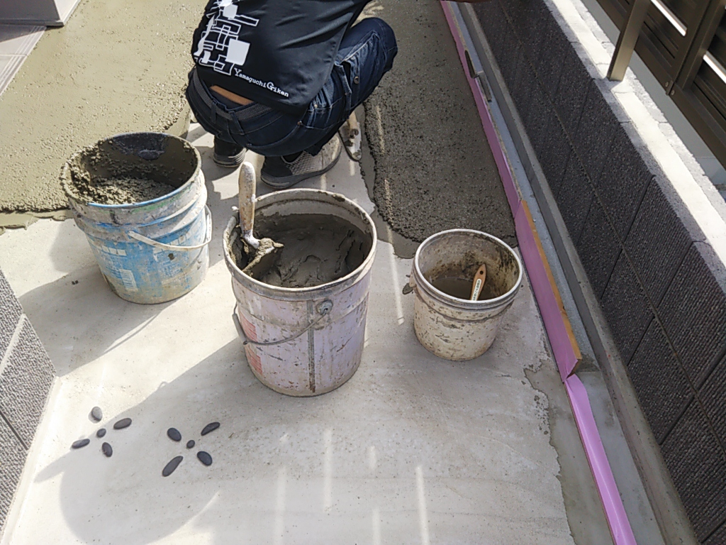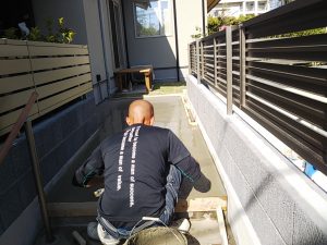 バルコニーのFRP防水工事が完了しました。今回はバルコニー奥行きの半分が1階部屋の上にかかるルーフバルコニー形式。ひとまず雨対策もできました。