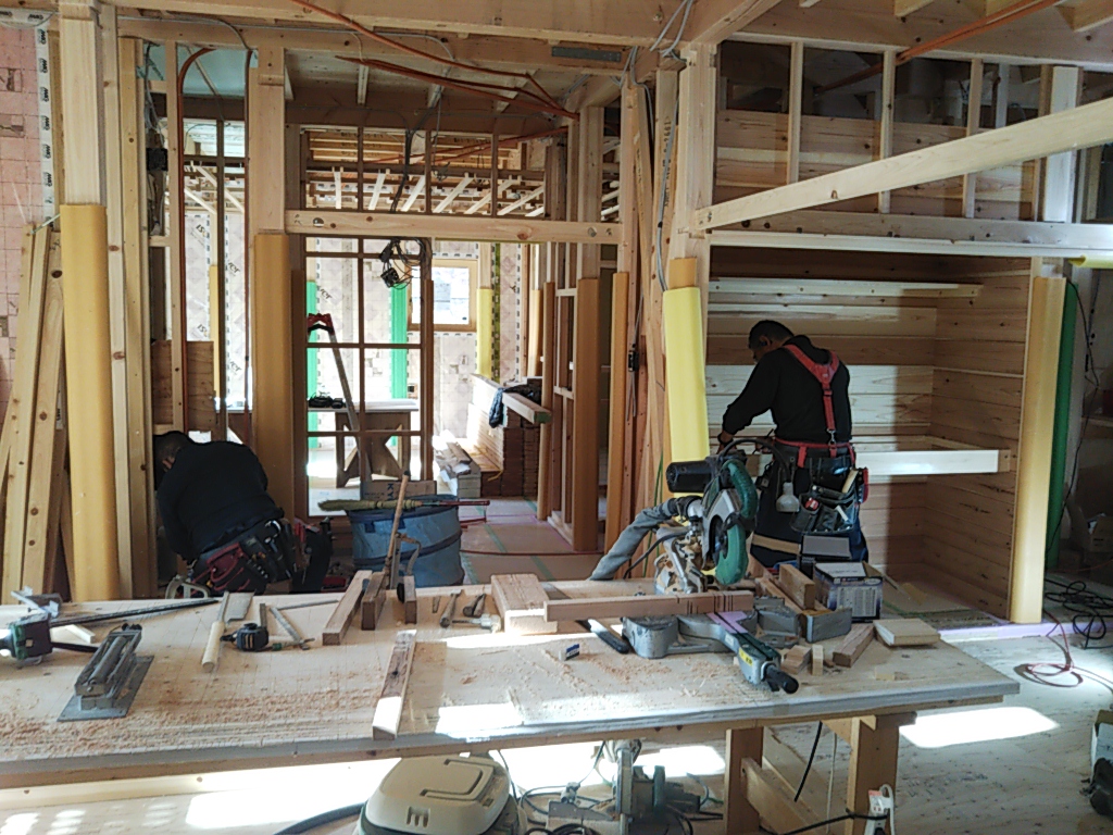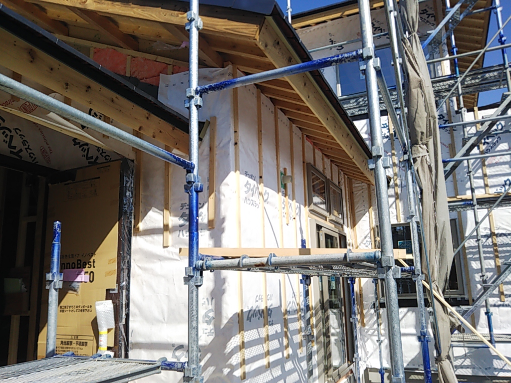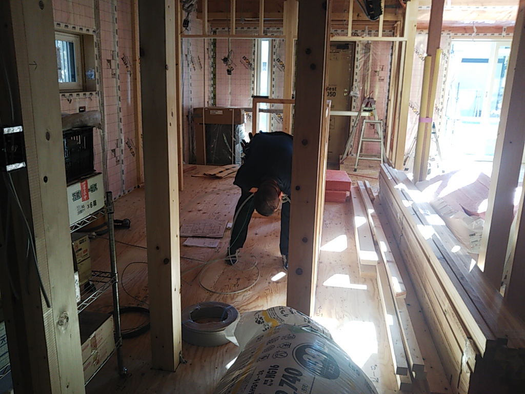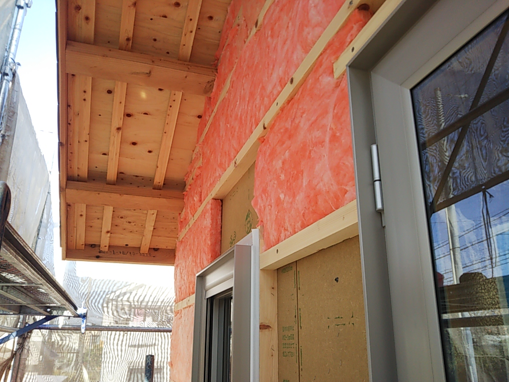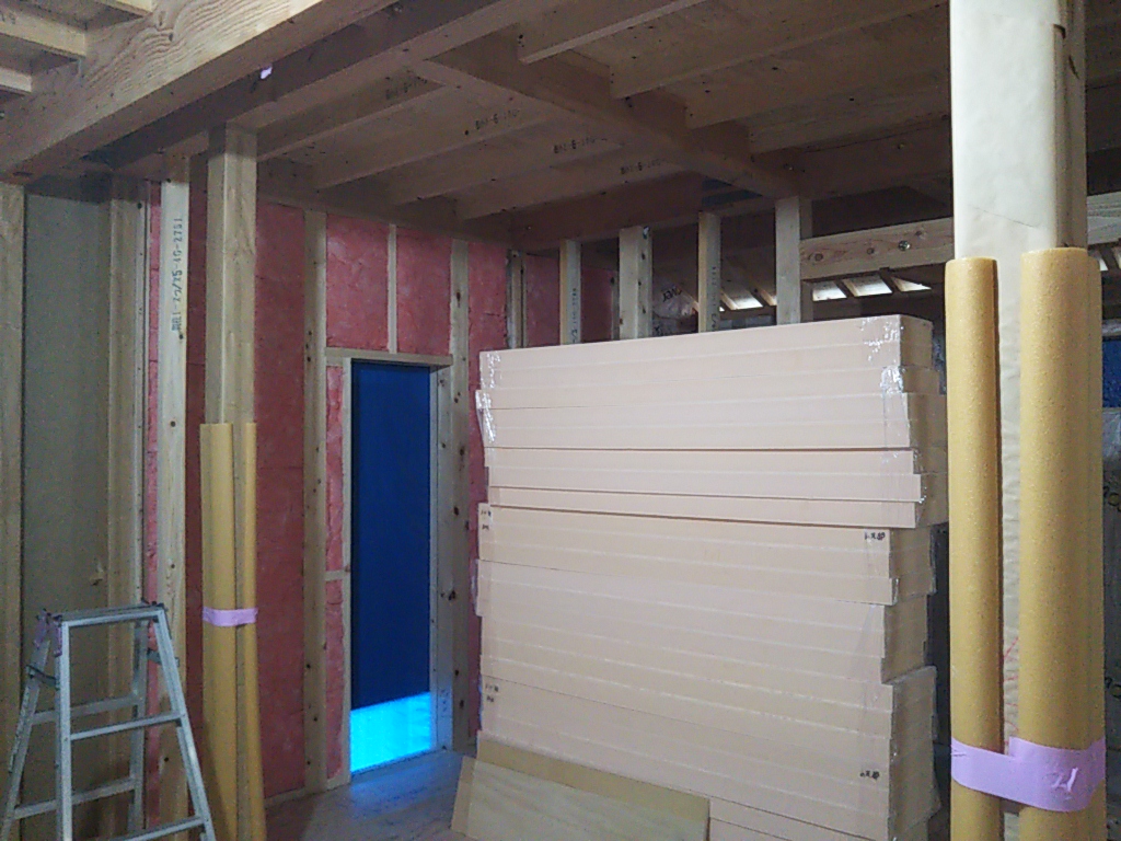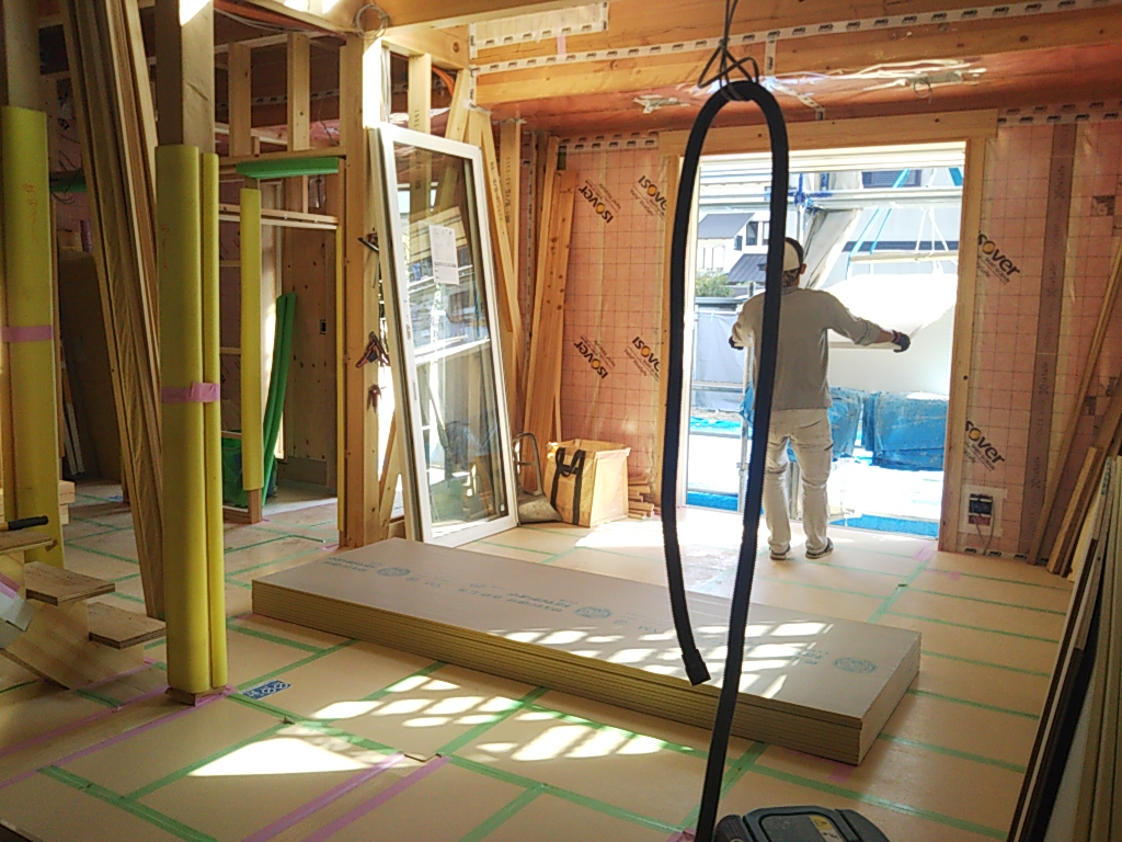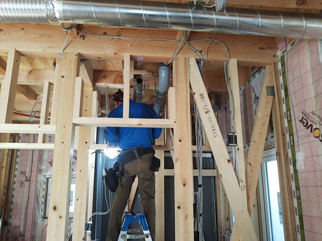 外部では付加断熱材の下地打ち工事が進んでいます。しかしこの住宅は大きいので棟梁も大変です。今日は早朝は非常に寒かったものの、日中は夏に戻ったような暑さ。棟梁も寒暖差で体調を崩さないように気を付けてほしいものです。
