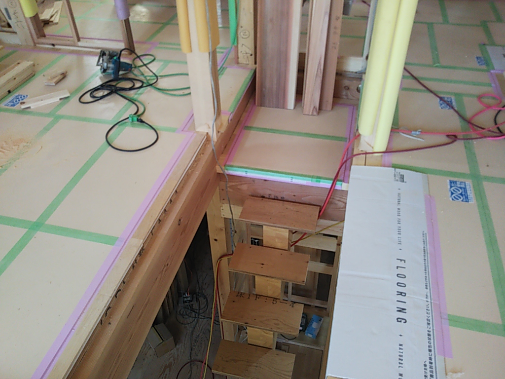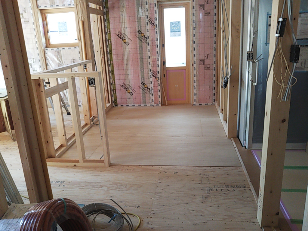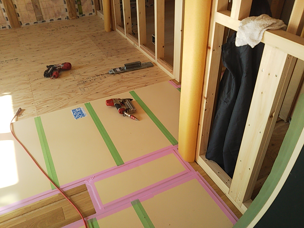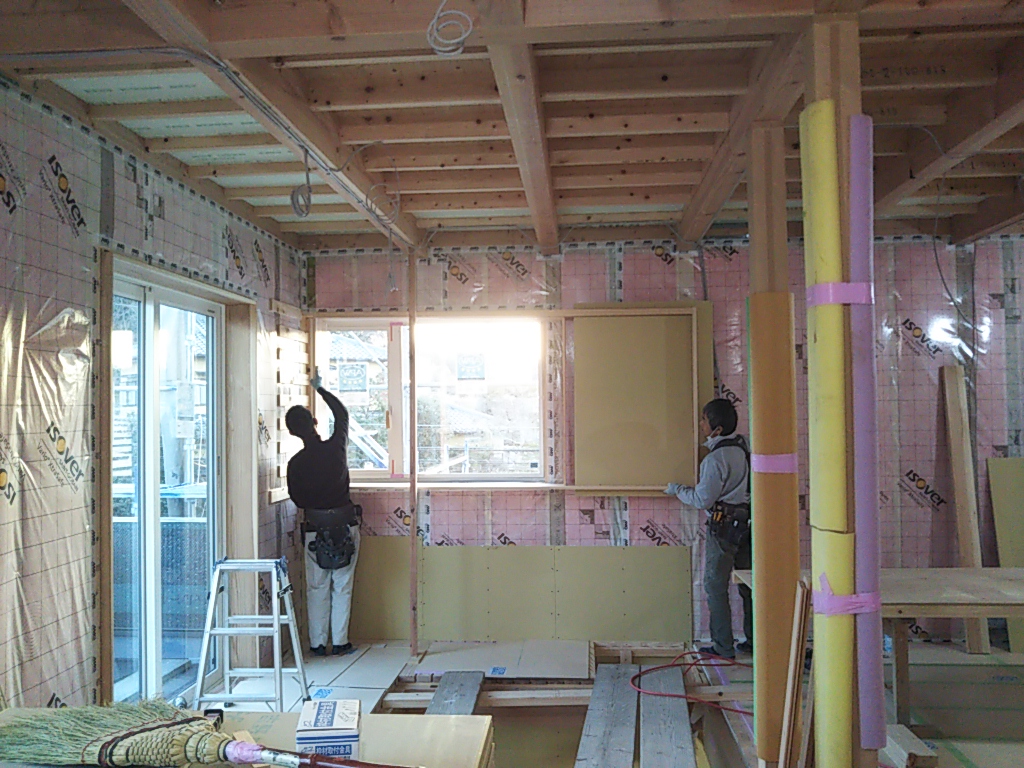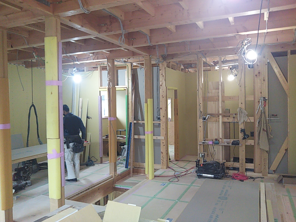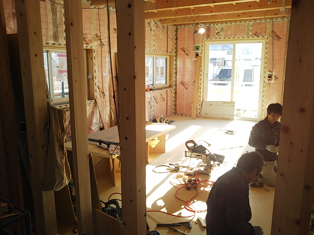 外部では付加断熱材の下地打ち工事が進んでいます。しかしこの住宅は大きいので棟梁も大変です。今日は早朝は非常に寒かったものの、日中は夏に戻ったような暑さ。棟梁も寒暖差で体調を崩さないように気を付けてほしいものです。