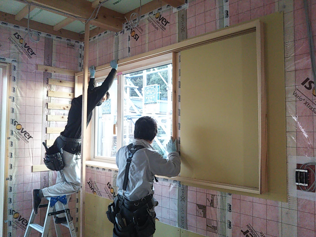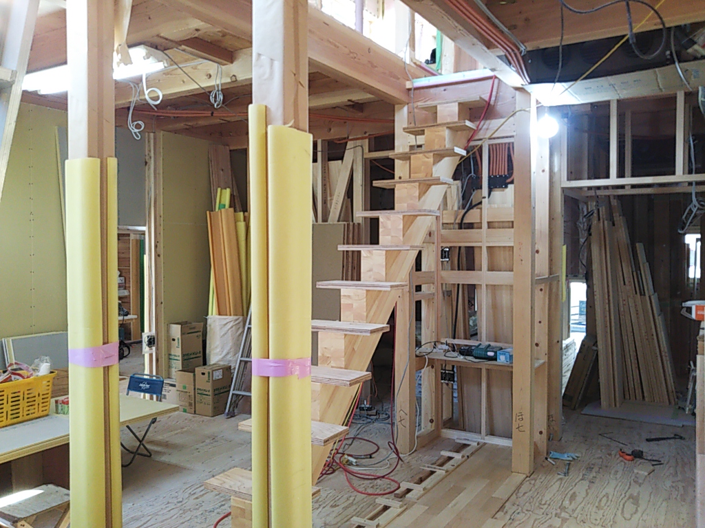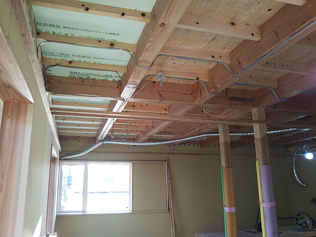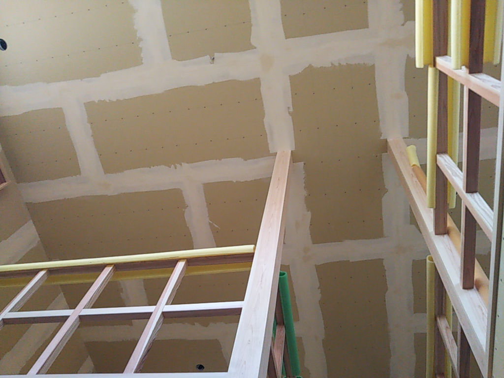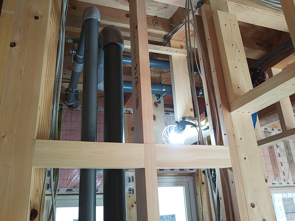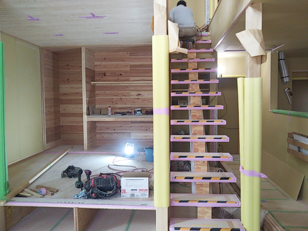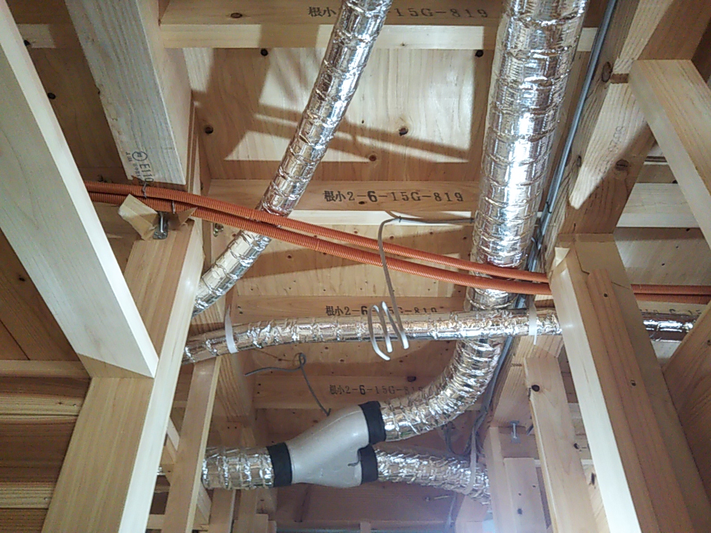 外部では付加断熱材の下地打ち工事が進んでいます。しかしこの住宅は大きいので棟梁も大変です。今日は早朝は非常に寒かったものの、日中は夏に戻ったような暑さ。棟梁も寒暖差で体調を崩さないように気を付けてほしいものです。