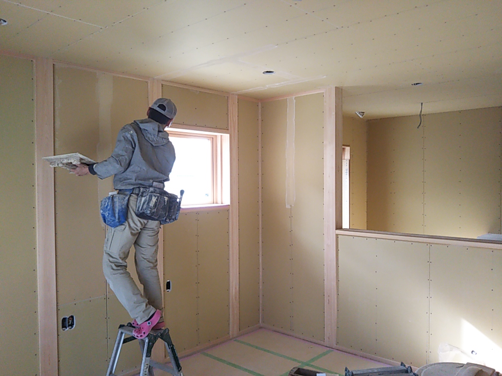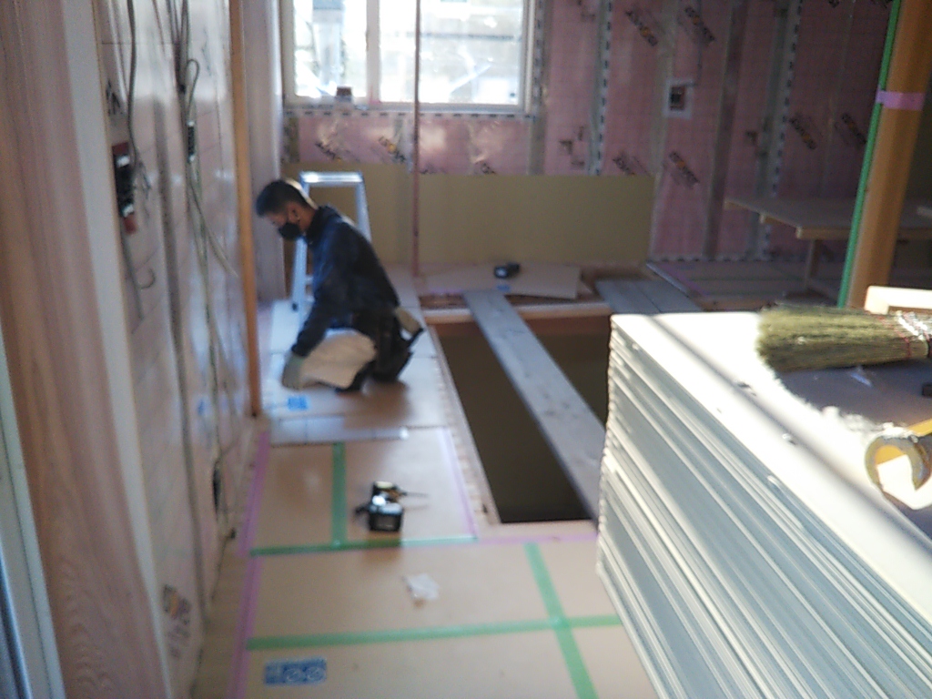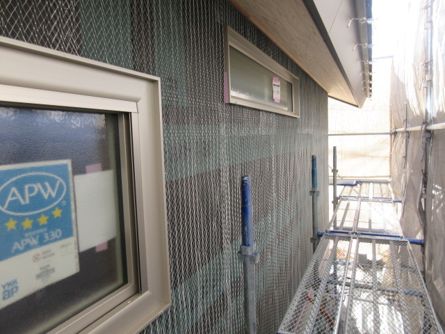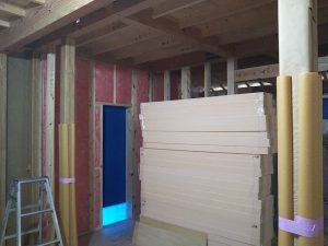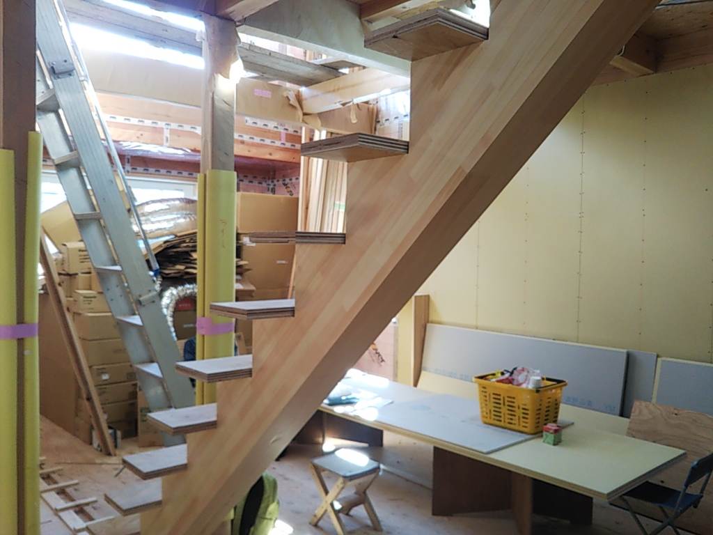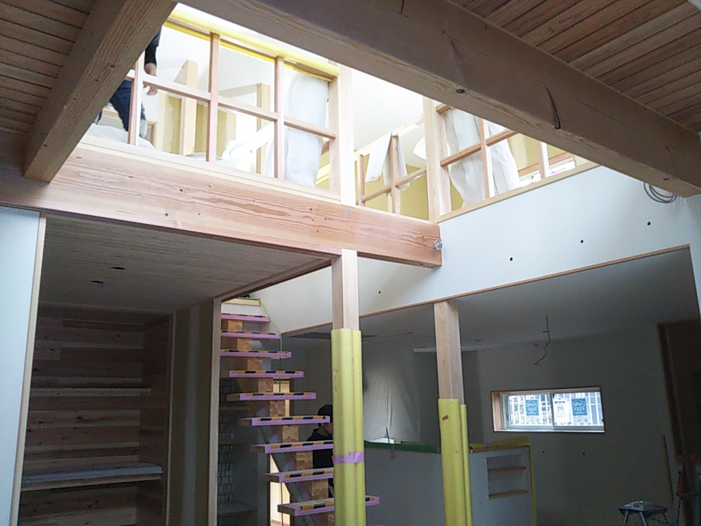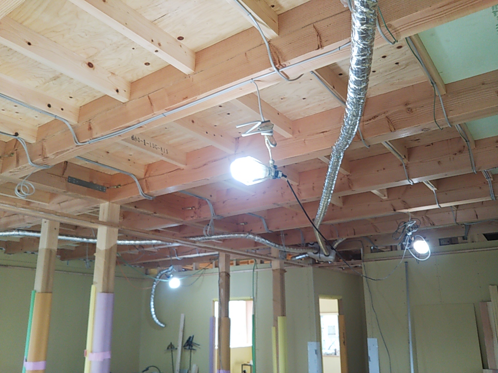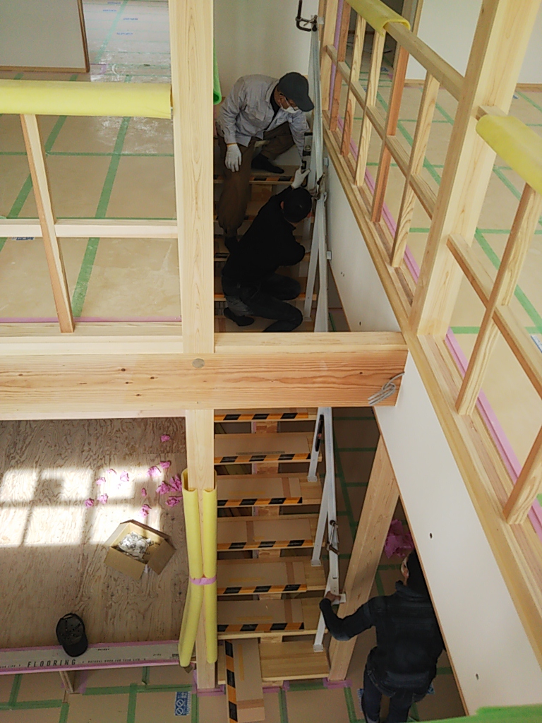 外部では付加断熱材の下地打ち工事が進んでいます。しかしこの住宅は大きいので棟梁も大変です。今日は早朝は非常に寒かったものの、日中は夏に戻ったような暑さ。棟梁も寒暖差で体調を崩さないように気を付けてほしいものです。