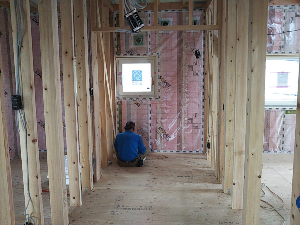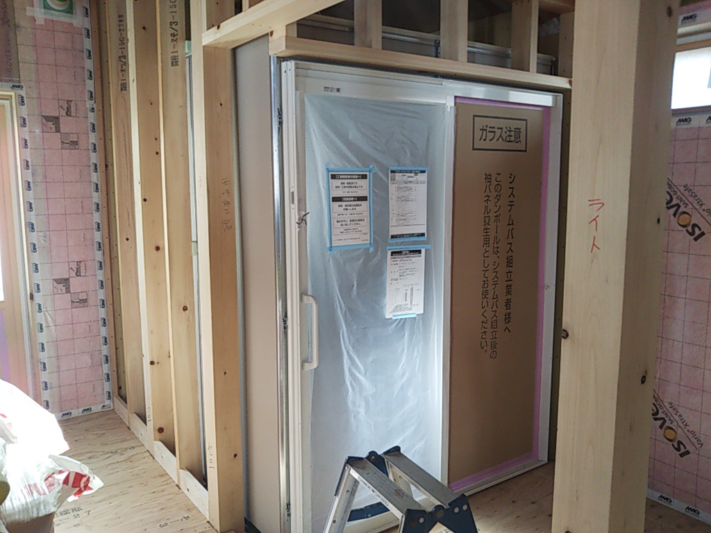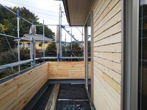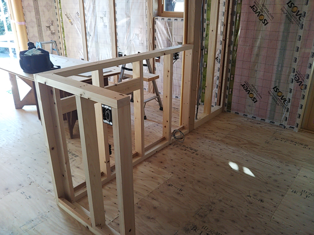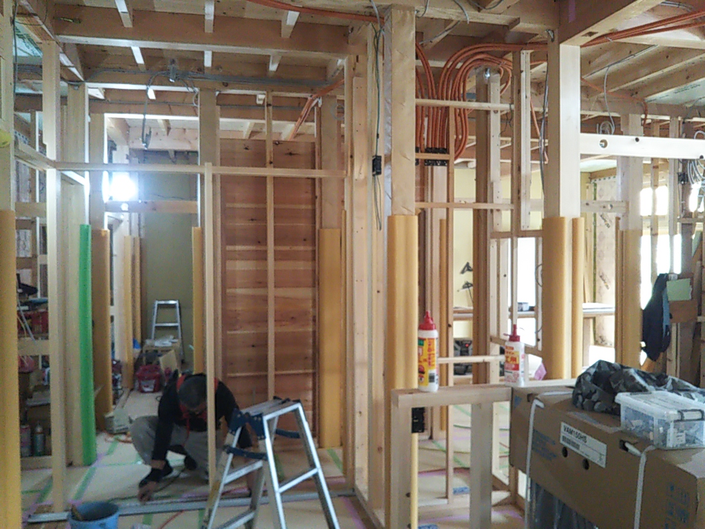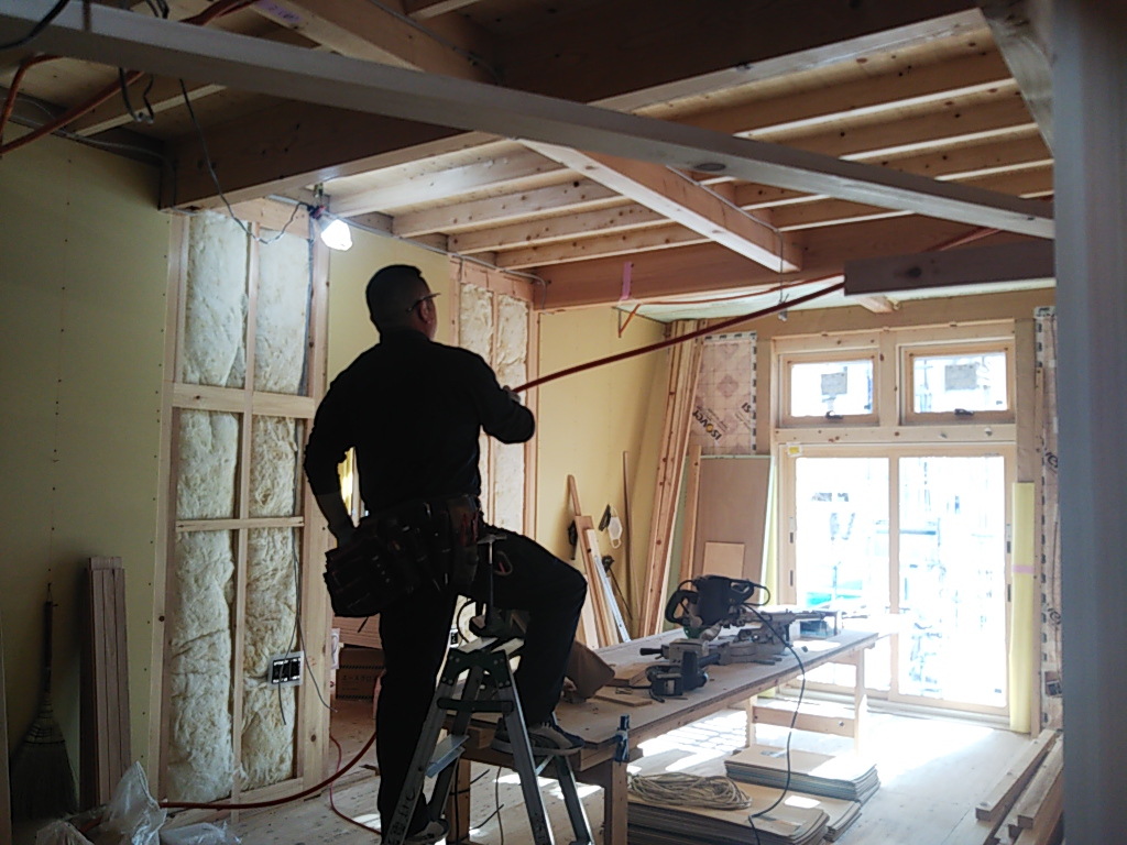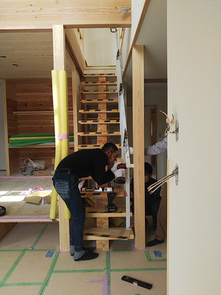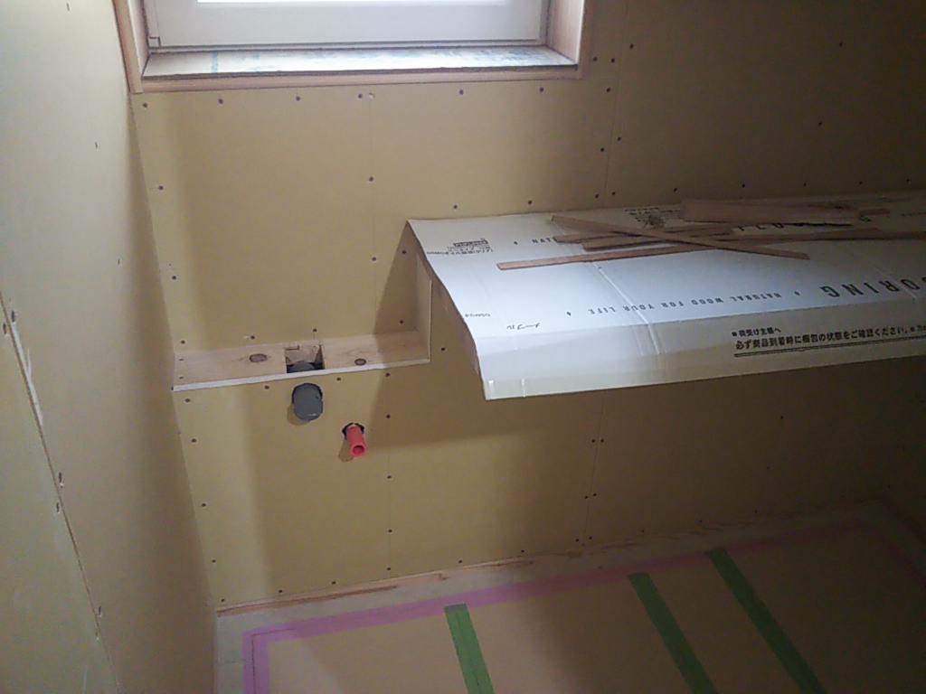 外部では付加断熱材の下地打ち工事が進んでいます。しかしこの住宅は大きいので棟梁も大変です。今日は早朝は非常に寒かったものの、日中は夏に戻ったような暑さ。棟梁も寒暖差で体調を崩さないように気を付けてほしいものです。