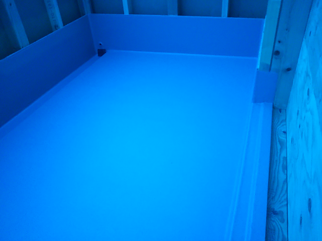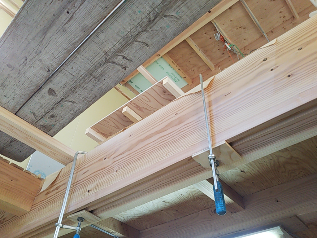 もっと作業しづらいのが『出隅』部分。段ボール箱の梱包を想像するとわかりやすいと思いますが、この角部分もできるだけピンホールができないように貼り合わせる必要があります。写真の部分は梁に直行する小梁が接合される部分。入隅と出隅が絡み合い、結構手間暇かかる場所です。
