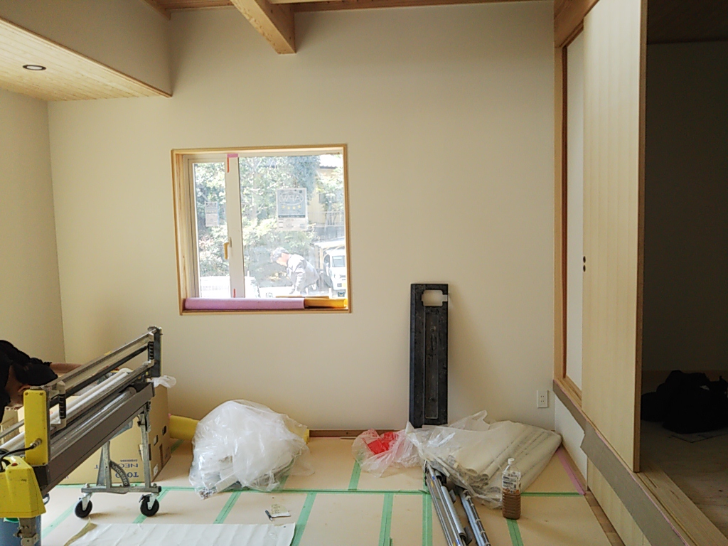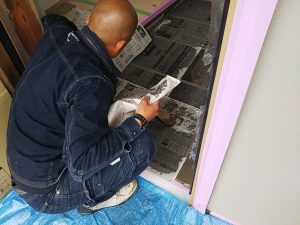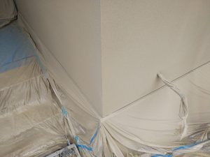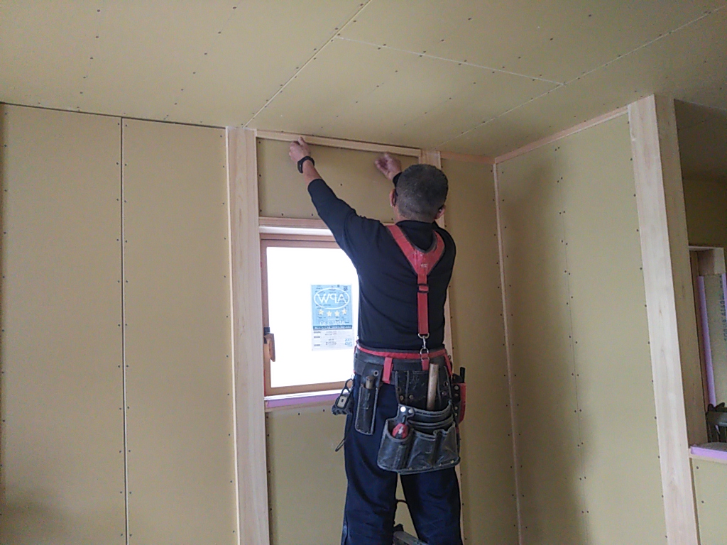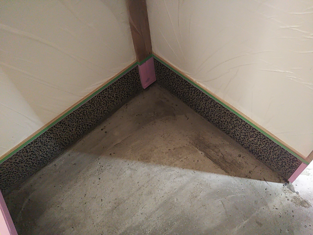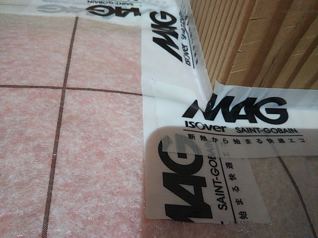少しテープ張りの作業をさせてもらいました。糊が強力なため、特に作業しづらいのが『入隅』部分。直角の両面に先にテープがついてしまいますと角にわずかな隙間が残ります。先に軽めにつけておいて平バールで角に押し込みできるだけ密着させました。