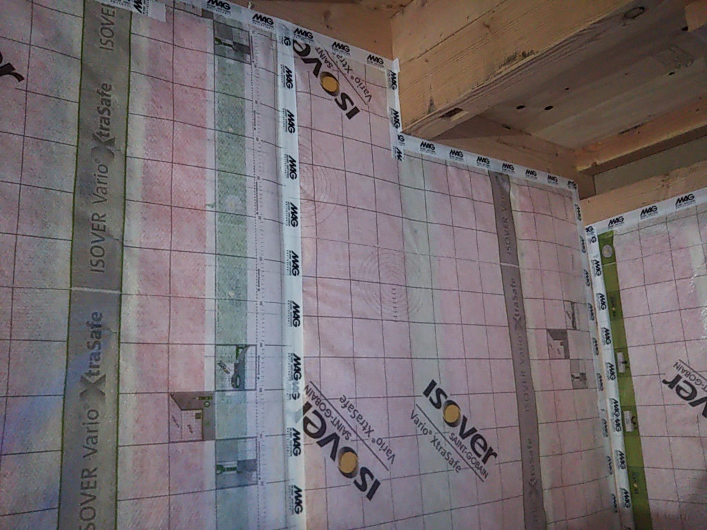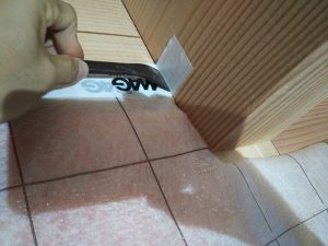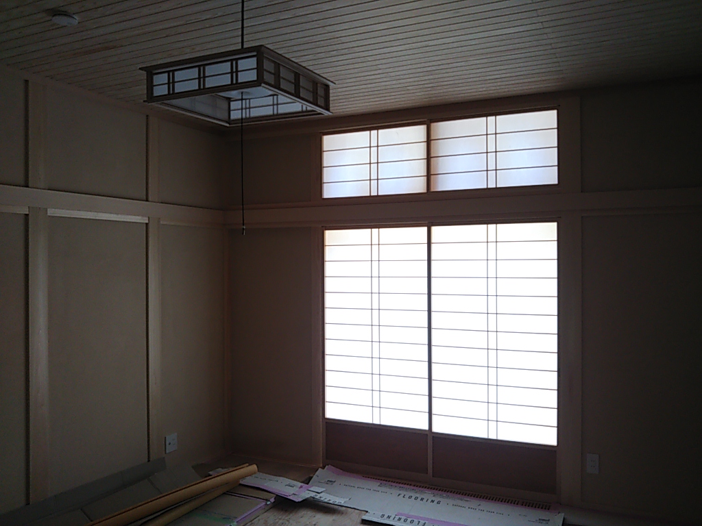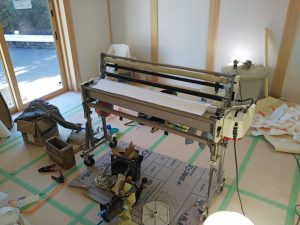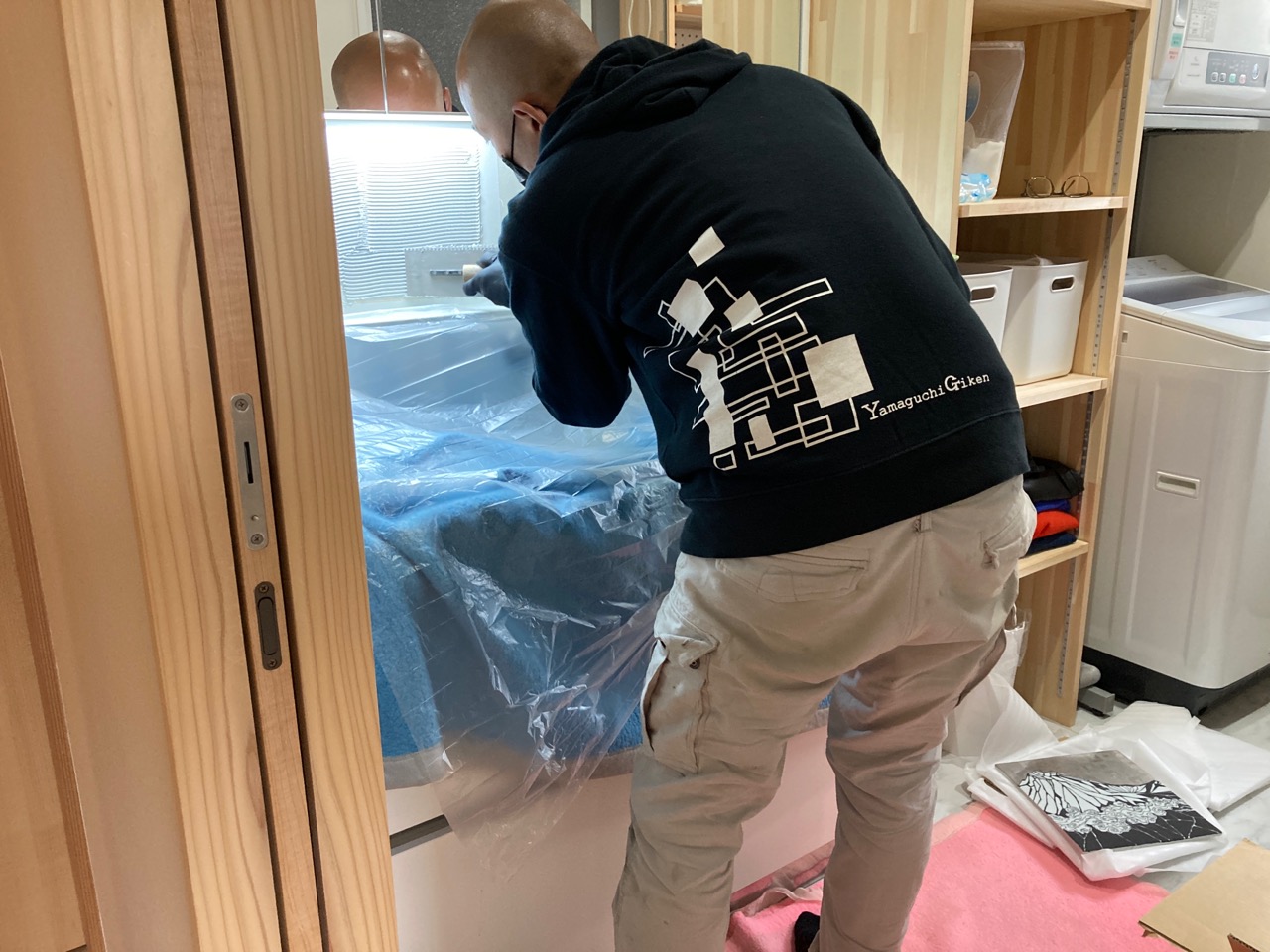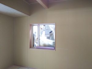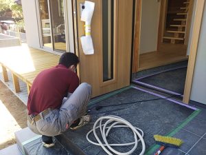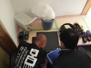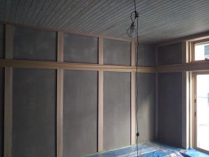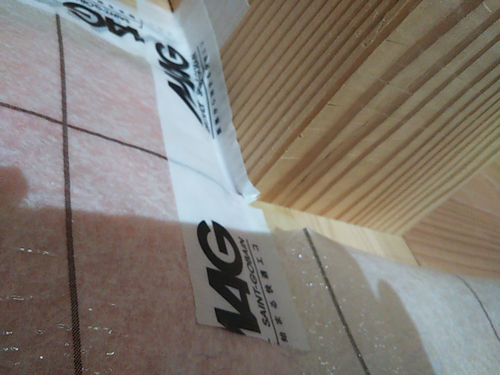 少しテープ張りの作業をさせてもらいました。糊が強力なため、特に作業しづらいのが『入隅』部分。直角の両面に先にテープがついてしまいますと角にわずかな隙間が残ります。先に軽めにつけておいて平バールで角に押し込みできるだけ密着させました。