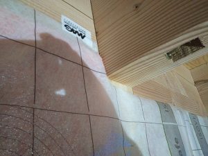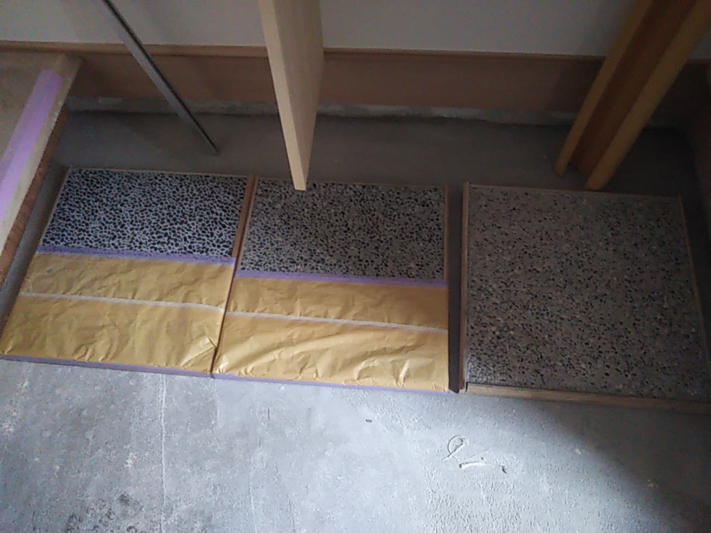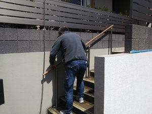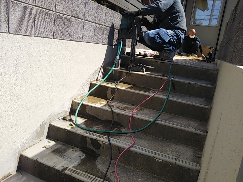 アプローチ階段の仕上工事にかかりました。まずはアルミ手摺の取付工事です。足元に湿式コア抜き機で穴を開け、支柱を差す部分をつくり、モルタルで固めた後、手摺を取付けます。モルタルが固まるまで手摺を動かすことは厳禁です。