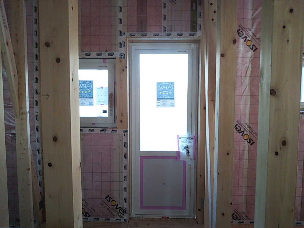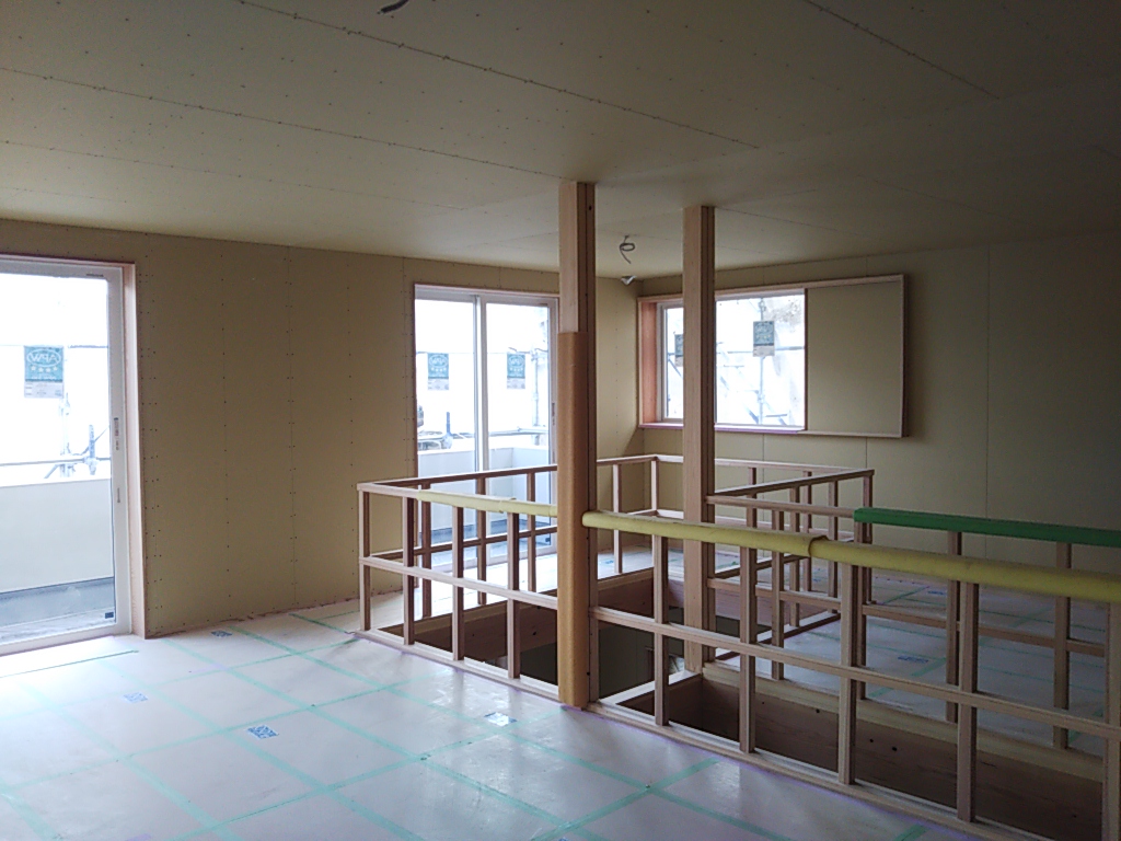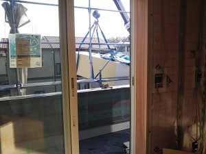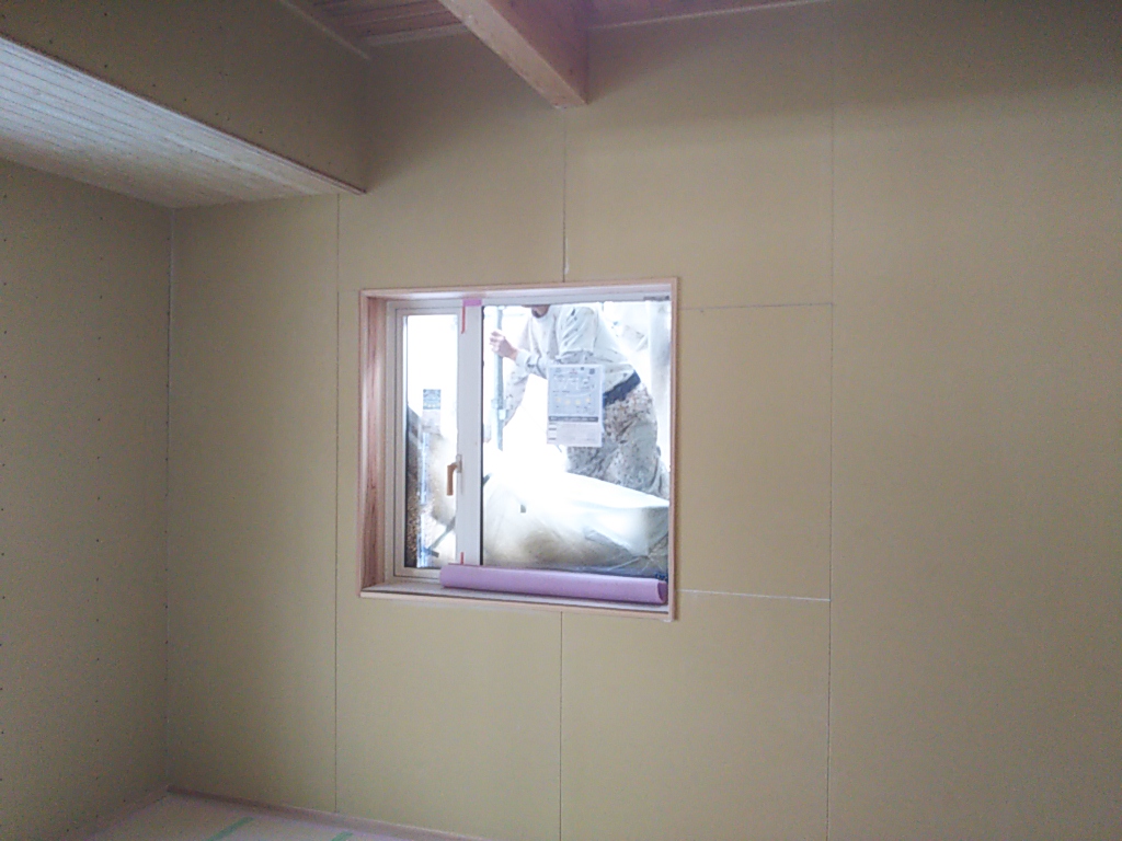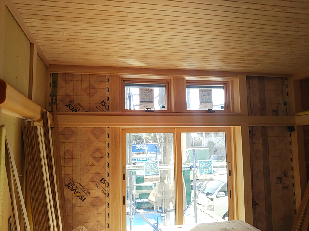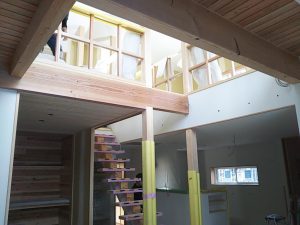 サッシが搬入され、取付けられました。先週までは雨風に備えて開口部に張ってあったブルーシートの青色が室内に移りこんで暗い印象でしたが、光が射す事によって一気に明るくなりました。