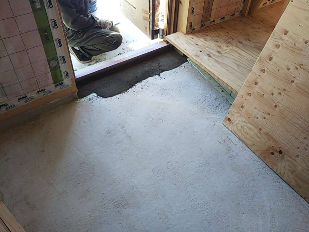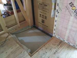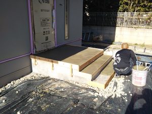 玄関ドアの沓摺下部のモルタル埋め工事。取付けられた玄関ドアの沓摺(下部分の枠の事です)と下地コンクリートの間には取付と土間床材のクリアランスとして数㎝の隙間が空いてます。工事中にうっかり踏んで曲がってしまわないように予めモルタルを詰め込んでおいて強度を持たせます。
