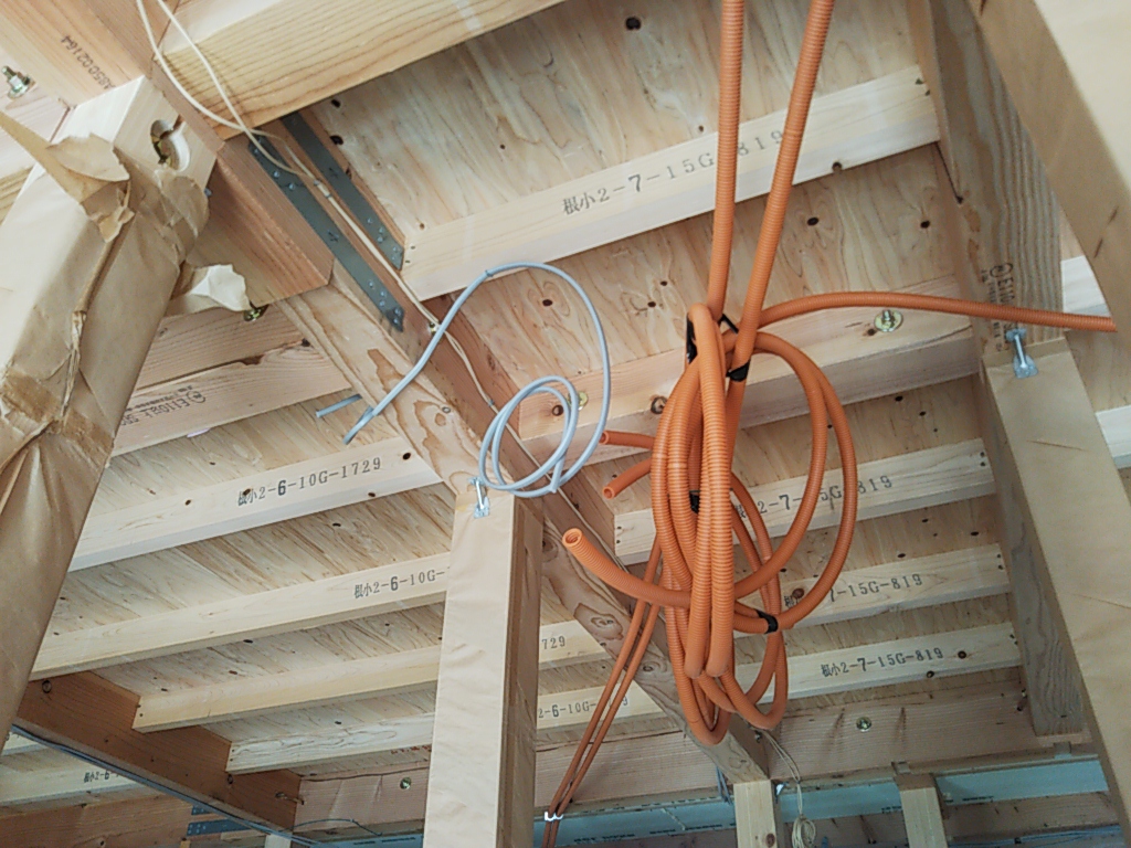 現場内にて電気配線のお打合せを行いました。平面図に電気記号を記したのみの図面では実際に部屋に立った時どのように見えるか分からないので、実際に内部へ入り検討を重ねます。まさに現場百篇。