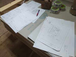 二人掛で広大な床面積の配置を出し終わりました。次回お盆明けに地盤改良工事に入ります。