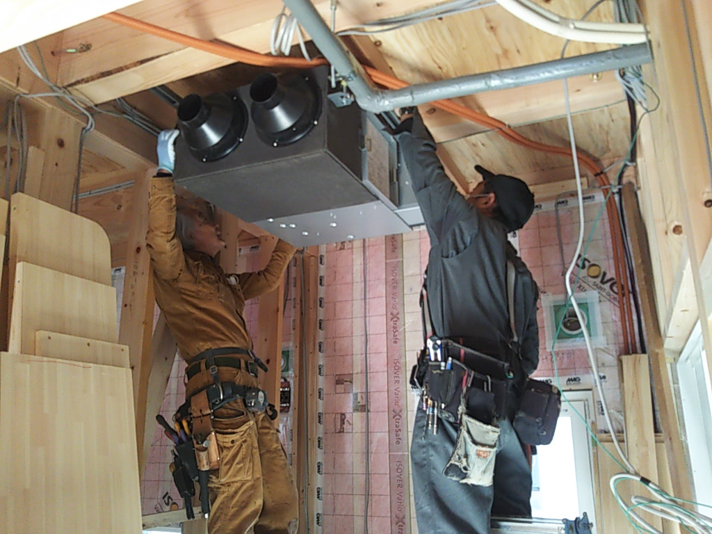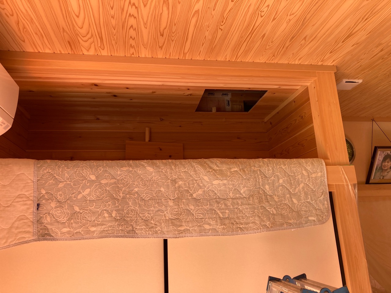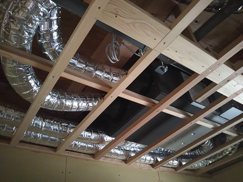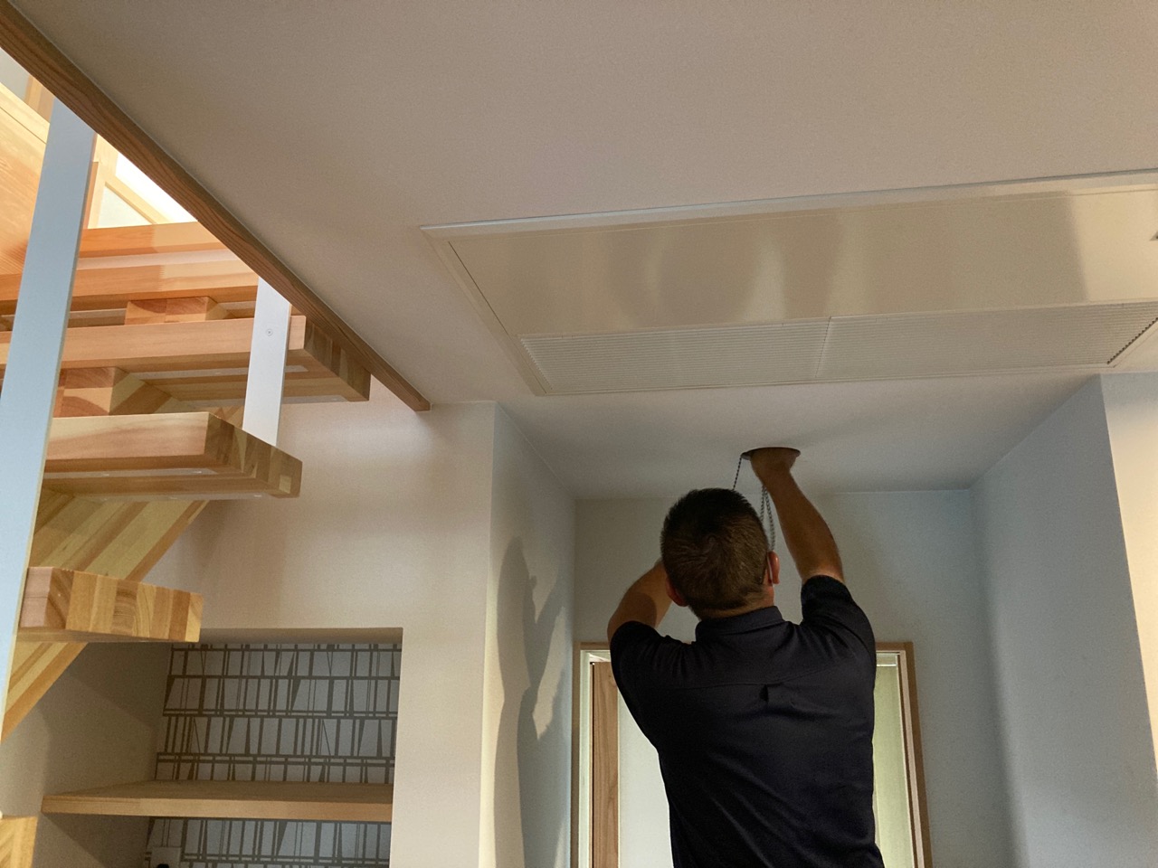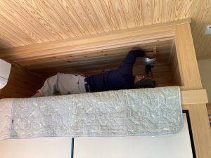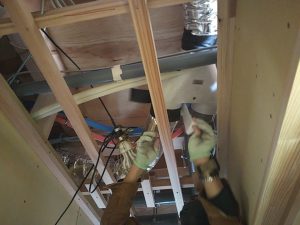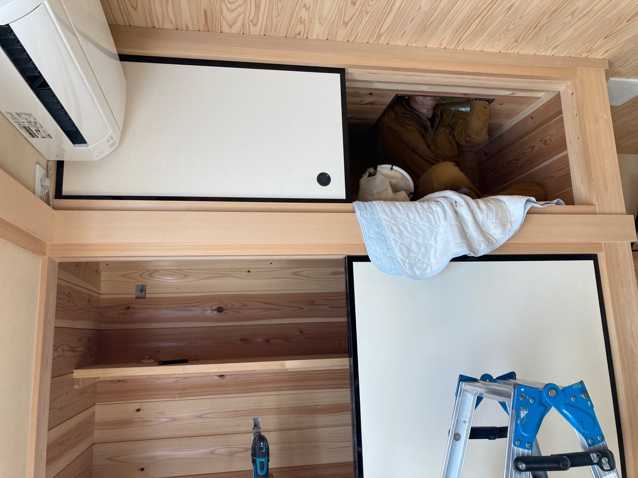 この住宅には熱交換換気扇が設置されているのですが、各居室にも局所換気扇が欲しい、との事で後施工になりますが、取付にうかがいました。 換気扇、ダクト配管、スイッチへの配線をできるだけ目立たないように施工する事が要求されます。仕上前の工事中であればいかようにもできますが仕上がった後となると少し知恵をひねらなければなりません。壁の裏や天井裏に配管配線スペースが取れる事を確認し、各箇所に穴を開けていきます。押入の天袋でアクロバットな体勢で作業するのはs戸棟梁。決してド●えもんではありません。天井裏にダクトを入れるための点検口を開けている途中です。