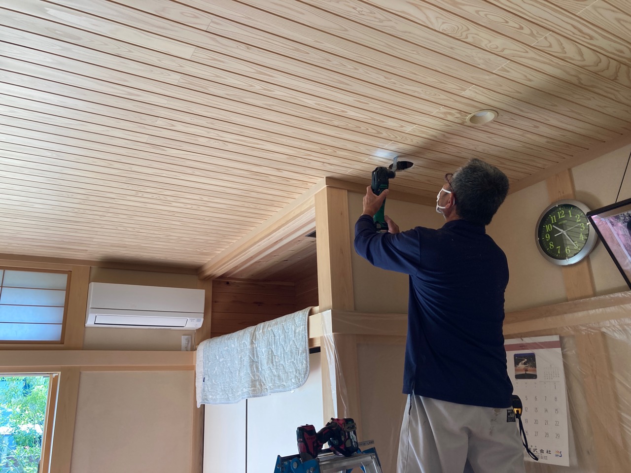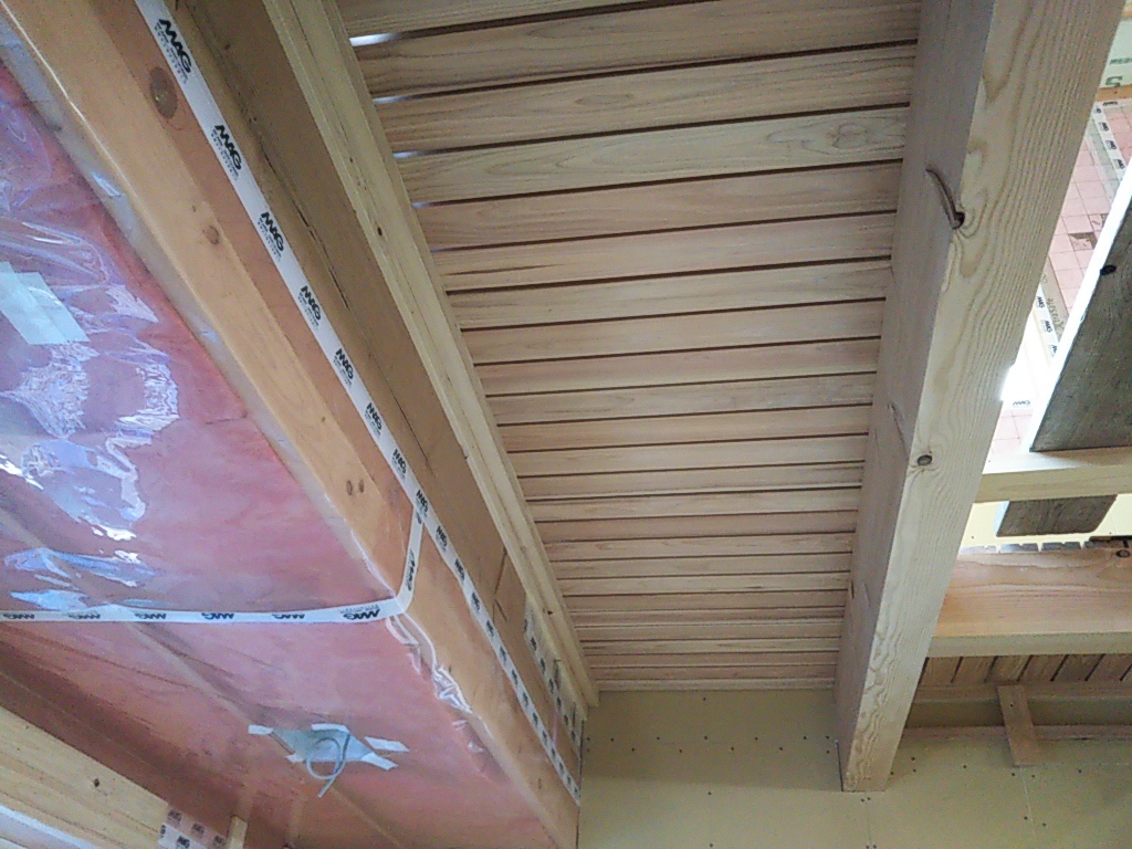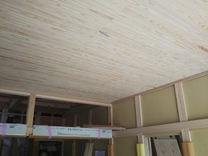 実(さね)付の天井材のため途中は至極順調に張って行けるのですが、最後辺りが少々複雑になります。その場で考えられる方法を駆使して何とか収めていきます。