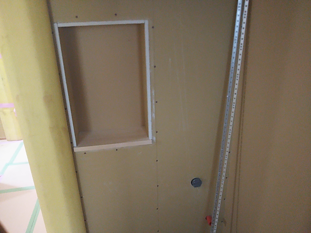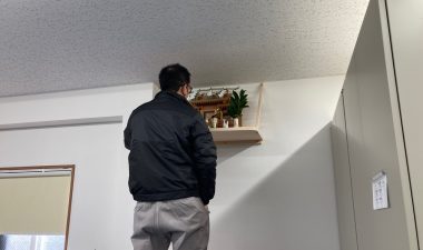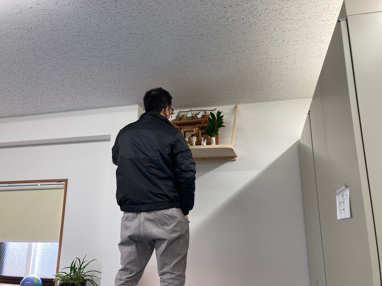 暮れも押し迫った本日y様の事務所に神棚を取付けにうかがいました。元々あった場所から新たなところへ移したいため新規に作成した桧の棚板を吊っています。この建物は鉄骨構造のため、内装クロス下地のボード下地もおそらくはC型チャンネルで施工されていると考えられます。普段とは勝手が違う下地に取付けも四苦八苦しましたが、何とか取り付けられました。面白いもので、使用されている下地のせっこうボードは木造と同じく3尺×6尺のものでしたので、木造に置き換えてみて下地を渡す向きや間隔も同じ、その点だけは共通していますので下地の位置を探すのにはさほど苦労はしませんでした。