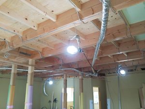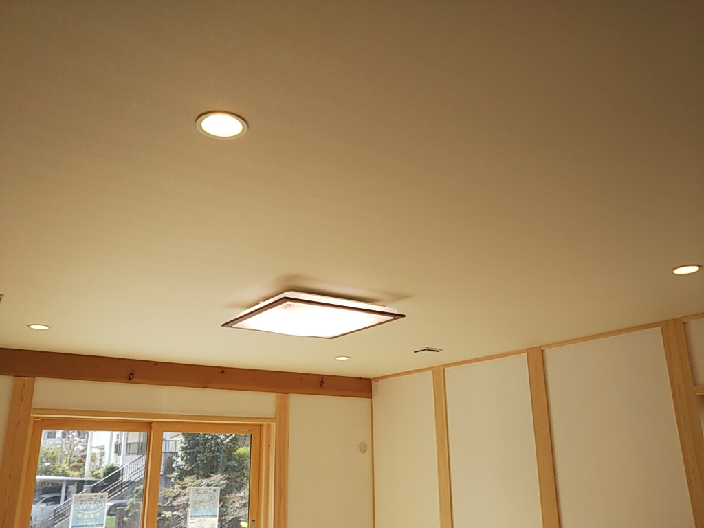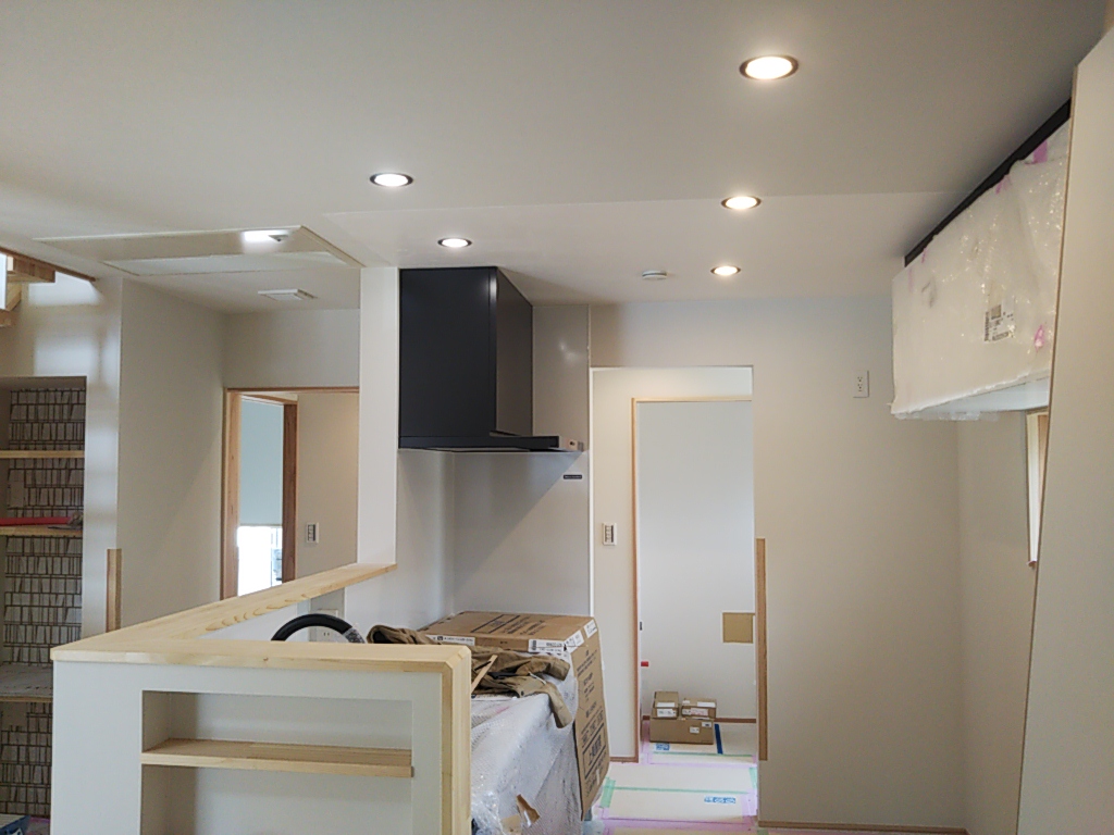 見事天井裏だけで配線工事を終えていざスイッチオン・・・点かない。配線は完璧なはずなのに何故だ??と電気業者さんと文字通り冷や汗を流しながらあれこれ原因を探っていると、取付説明書に見慣れぬ一文が。このような棒状の電球を使用するLDE(以前でいうところの蛍光管)は『給電側』という印がある方を器具の指定の方向に取付けなければならない、との仕様で今回は逆向きにはめ込んでおりました。蛍光管の感覚ではどちら向きでも取付けられるという頭でいたので意外と気付かないというオチでした。特に配線に問題があるわけではなかったのでほっと胸をなでおろしたところです。