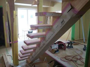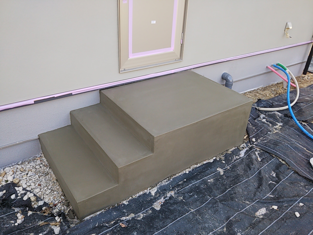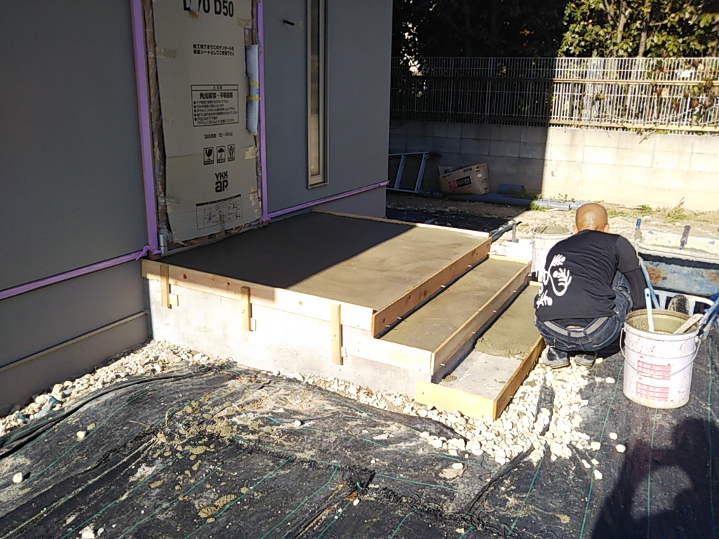 踊り場の下地をモルタルで形づくっていきます。7段ほどの階段ですが、最上段までモルタルを持って上がるのは人力です。これがまた重いのなんの。