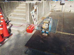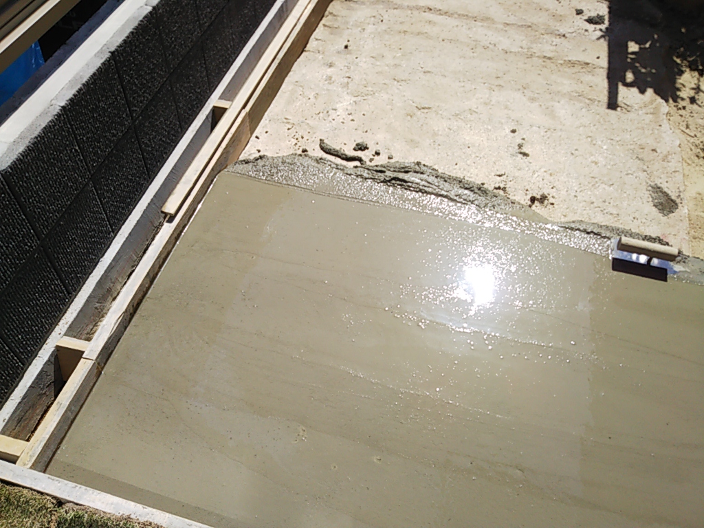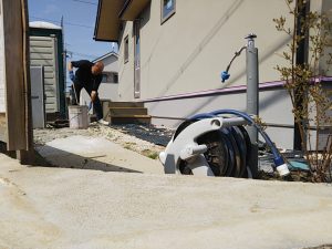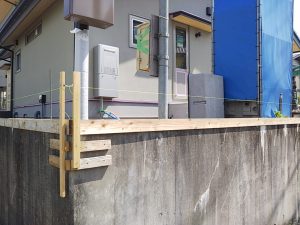 ※養生:コンクリートの品質を保つため、例えば現在のような夏季には打設後に強烈な暑さでコンクリートの水分が早めに乾かないように適度に散水などをして潤いをもたせます。コンクリートも硬化するまでは生物(なまもの)なので適度な保護が必要になります。