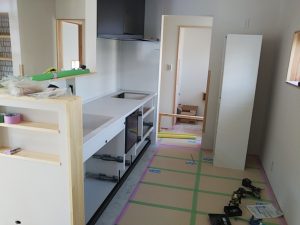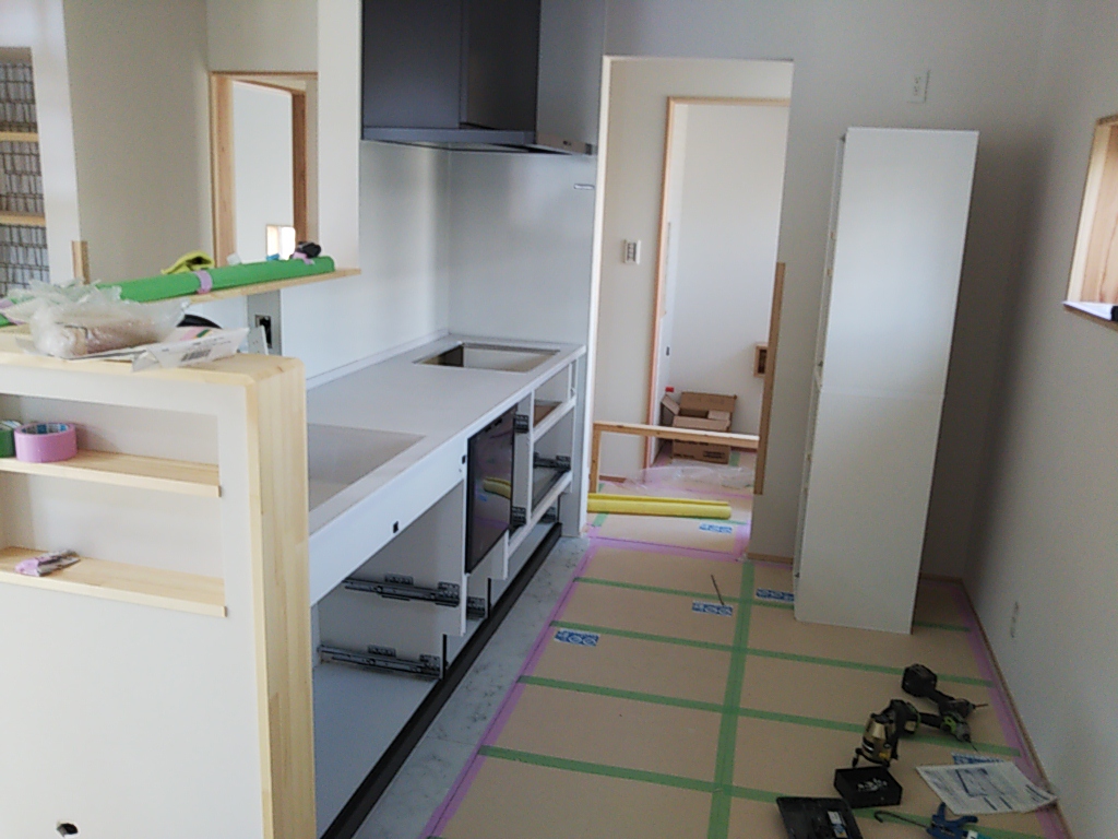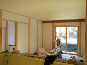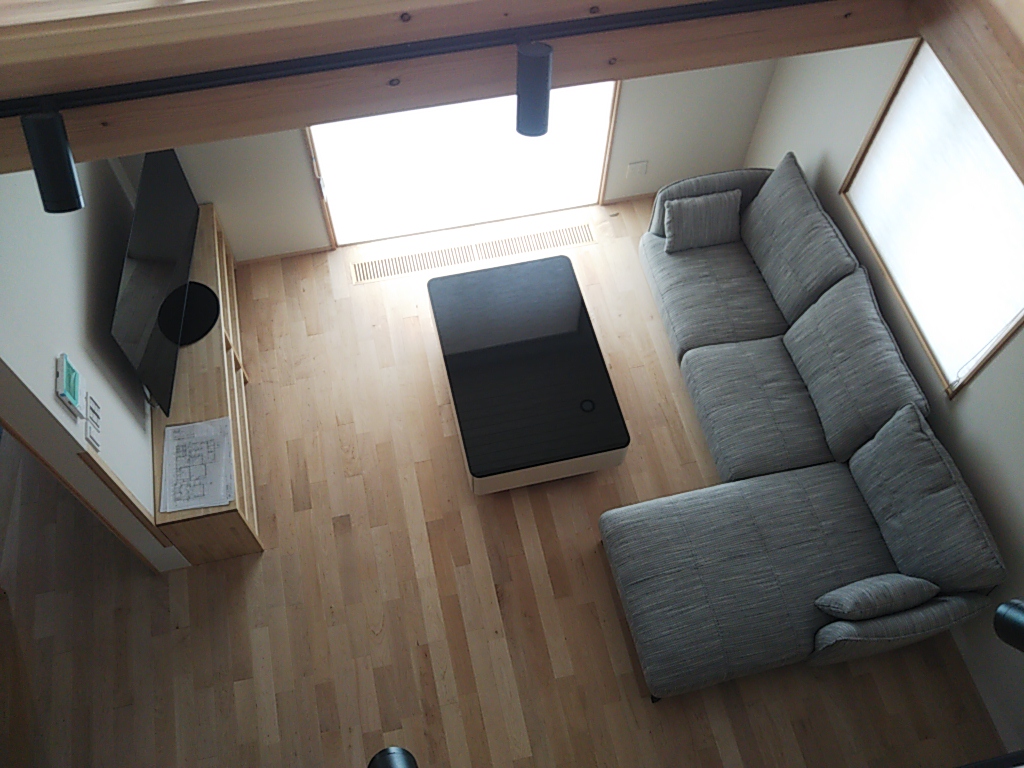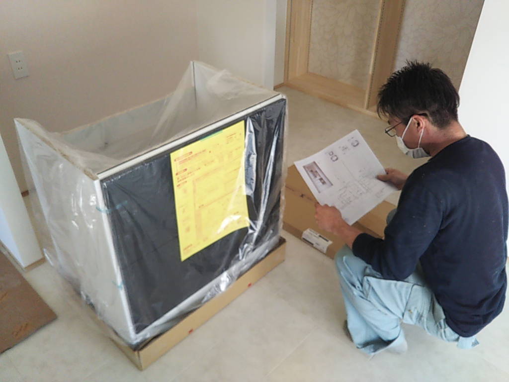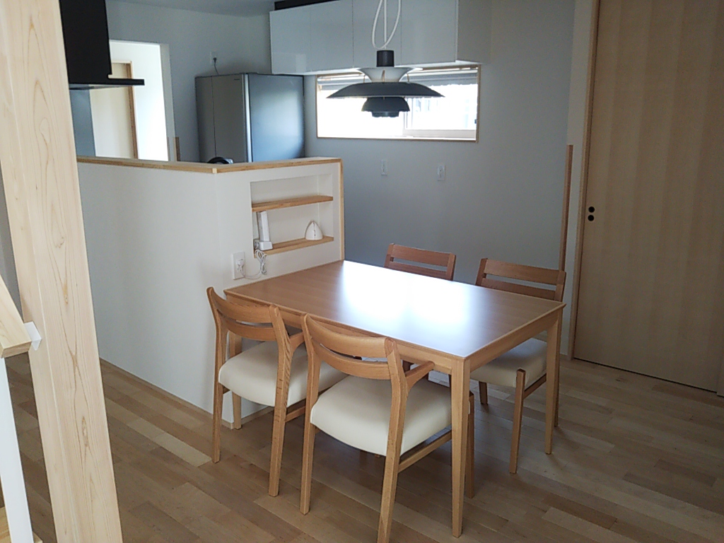 y様が購入された家具が搬入されました。リビングにはソファー、ダイニングには食卓が設置されるとやはりグッと部屋らしくなります。最近ではリビングには南側には採光掃き出し窓、他方にはダイニング、そのまた他方にはタタミコーナーが空間としてつながる、という間取りを造る事が多く、結果としてソファーがどの壁際にも置かれず部屋の真ん中ほどに置かれることが多いのですが、こうして壁を背面としてソファーを置くと人間の心理として何となく落ち着くな、と感じるのは私だけでしょうか。