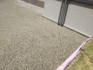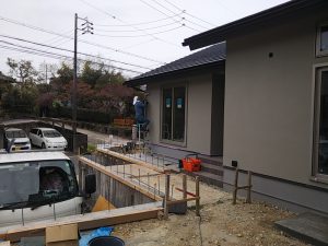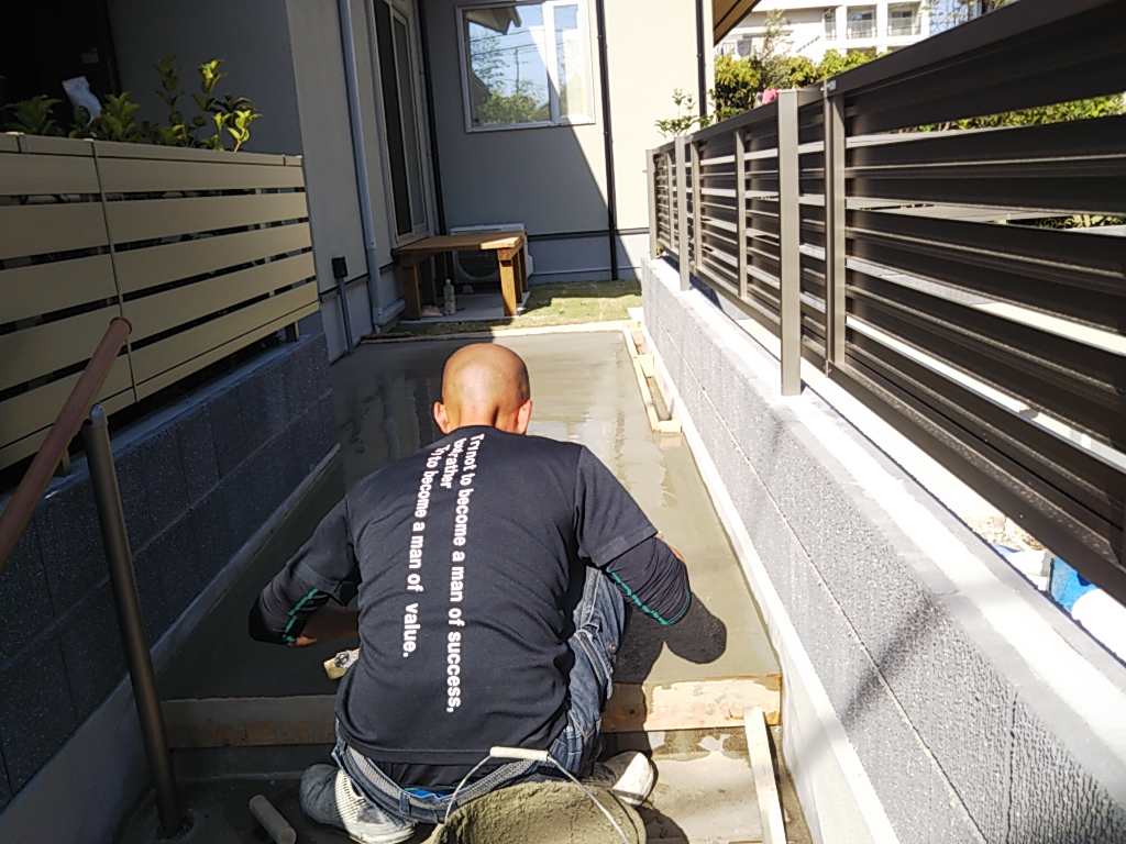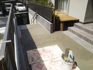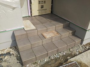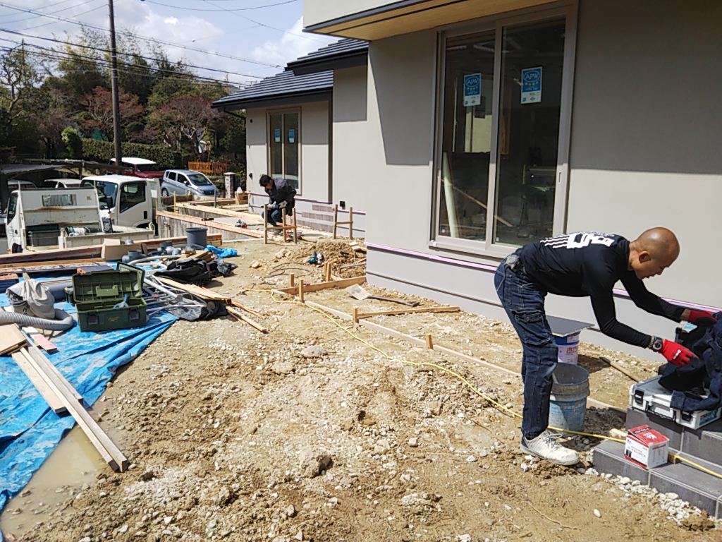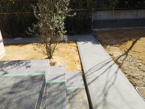 各玄関へのアプローチの土間コンクリートが打設されました。この住宅は二世帯分プラス一つの玄関がありますので、それぞれの玄関までの通路として庭を横断しています。