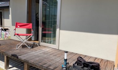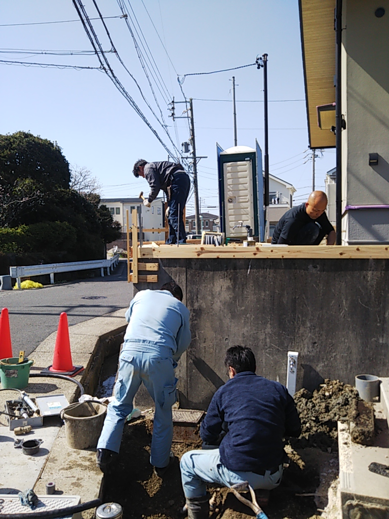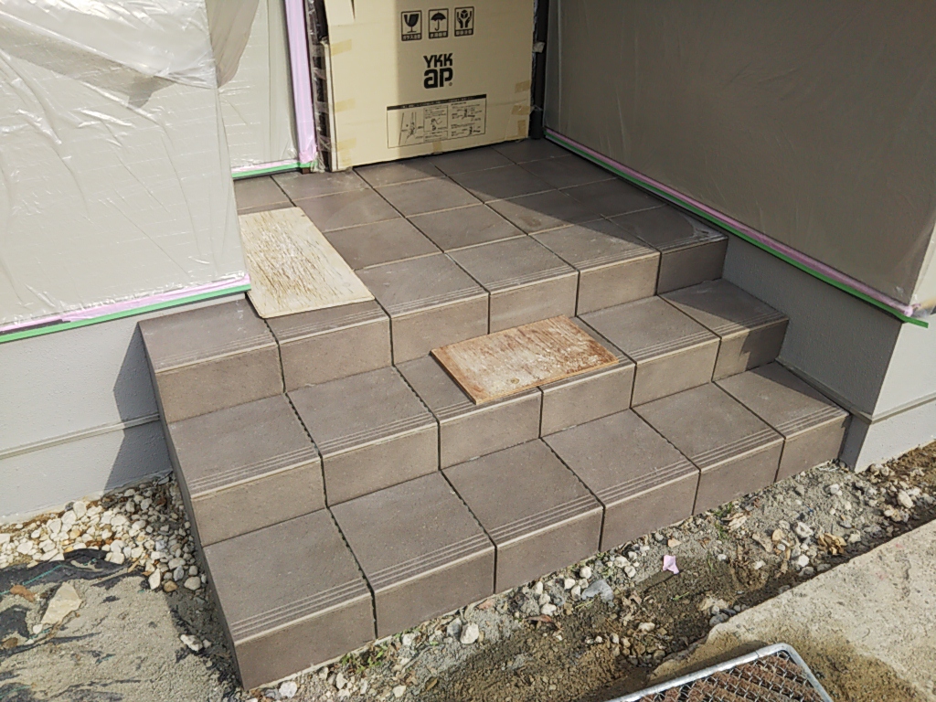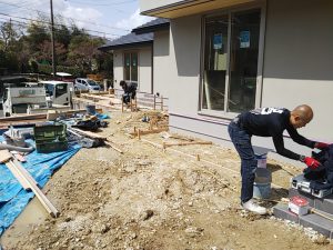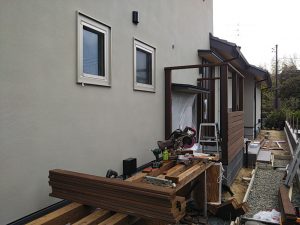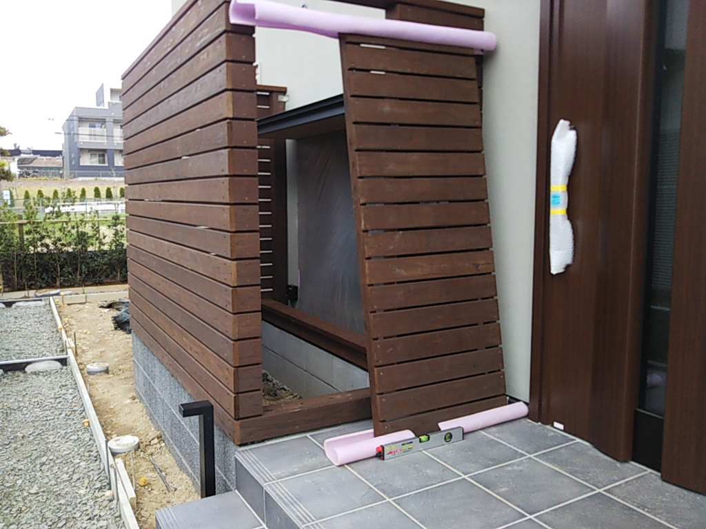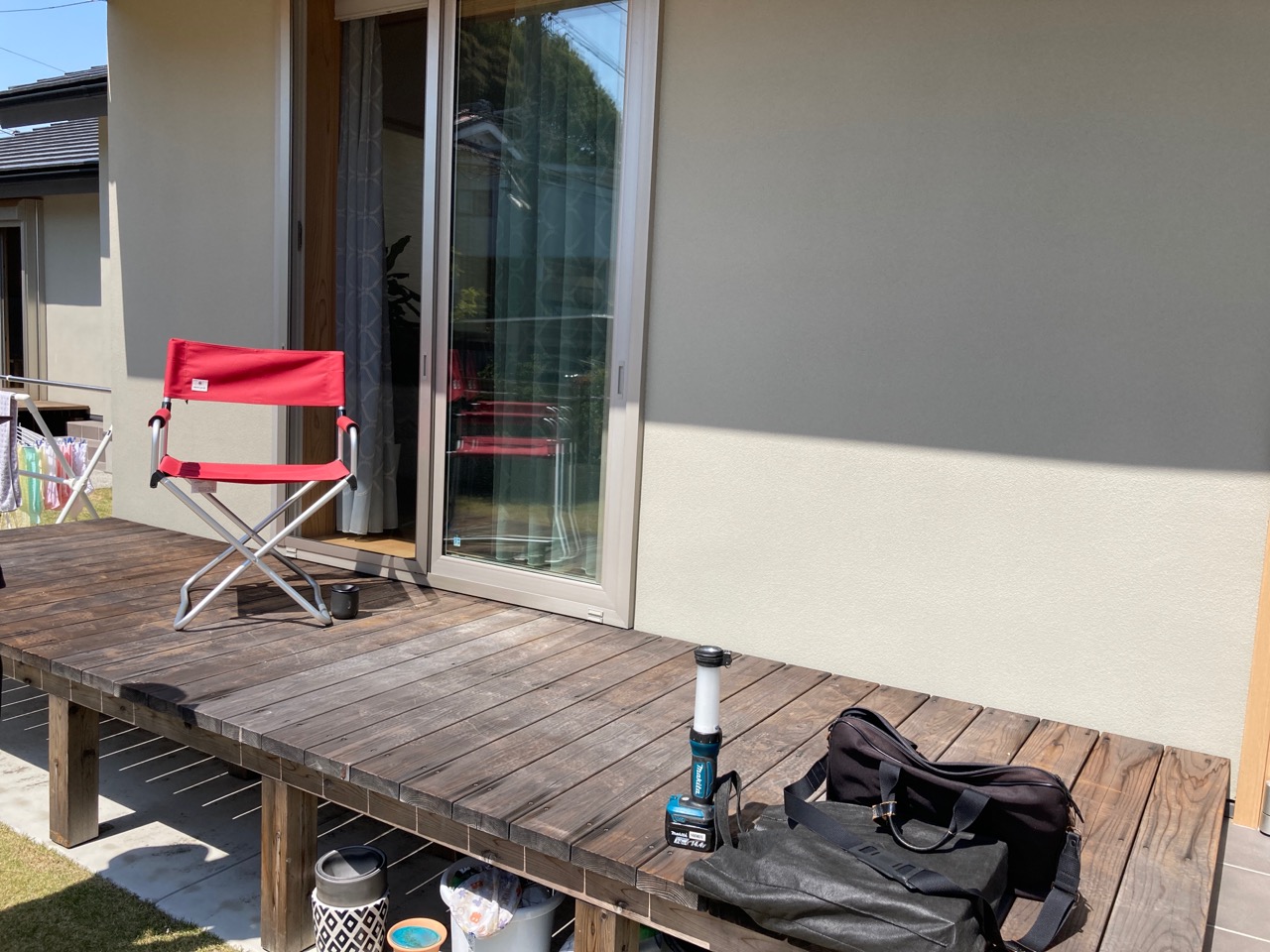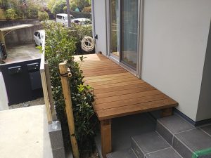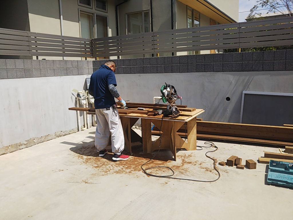 ブロックとフェンスと植栽と掃き出し窓の工程が複雑に絡み合う部分のウッドデッキを施工しました。今週末から天候が崩れるようですが、今日できてひとまず安心です。
