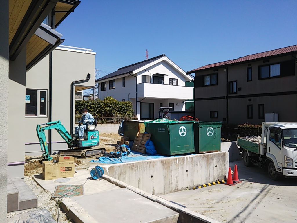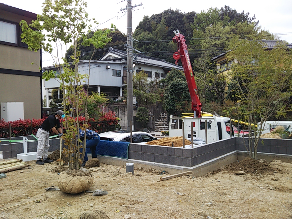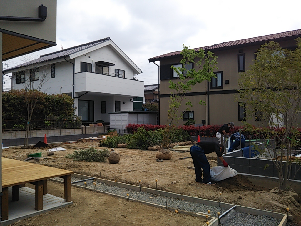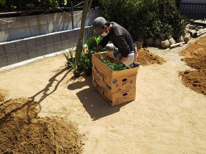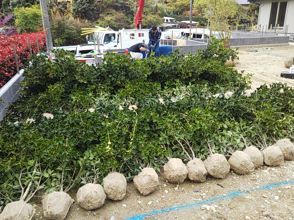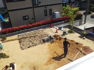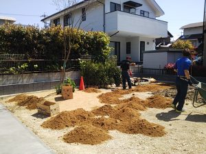 規定により敷地内を所定の面積分緑化する必要がある地域に指定されています。中木や生垣を植え終わったので後は地被植物となる芝生を植えて面積を満たします。その前に客土を搬入し均す作業があります。
