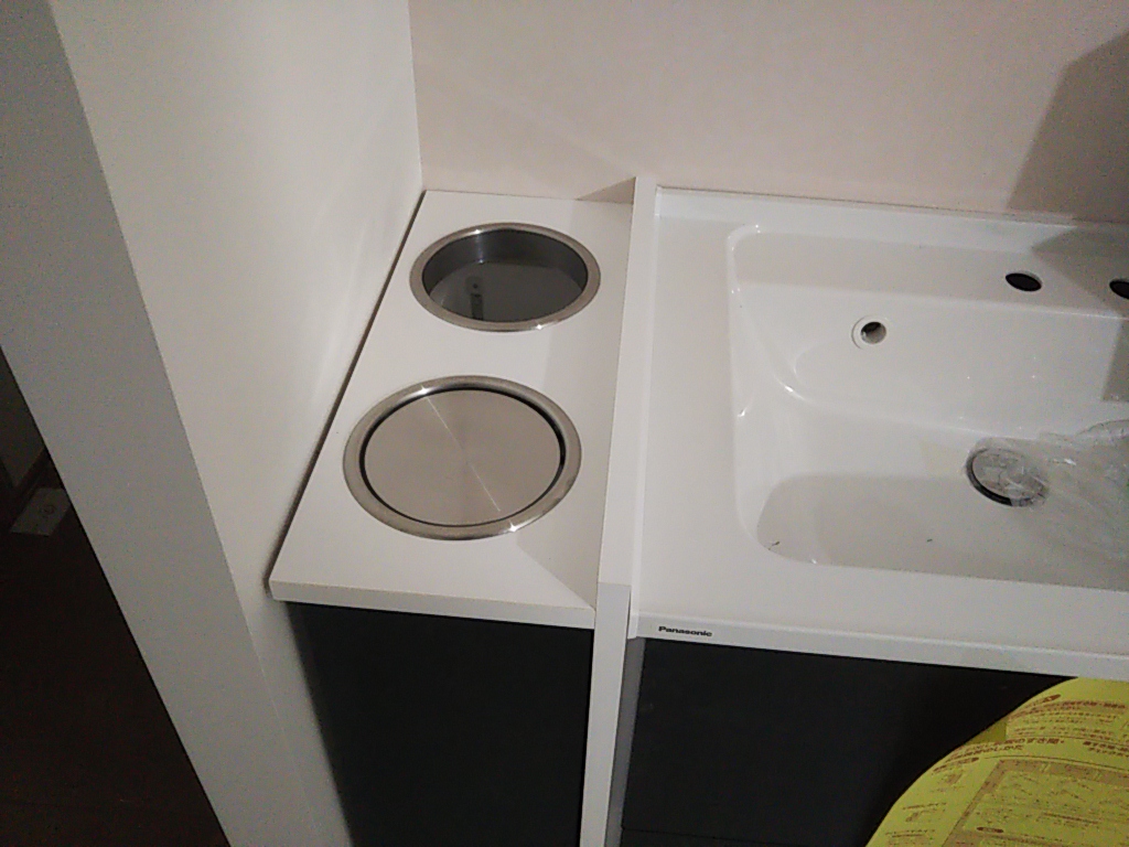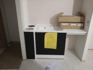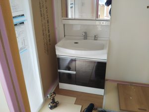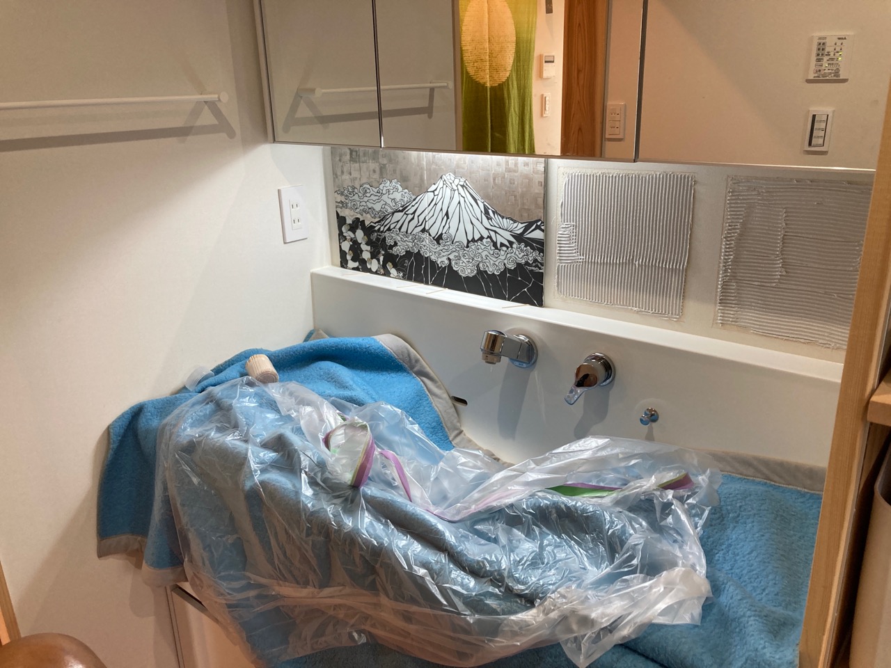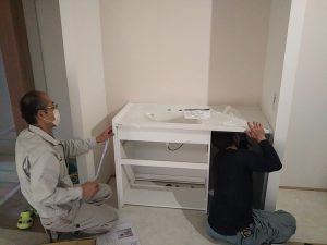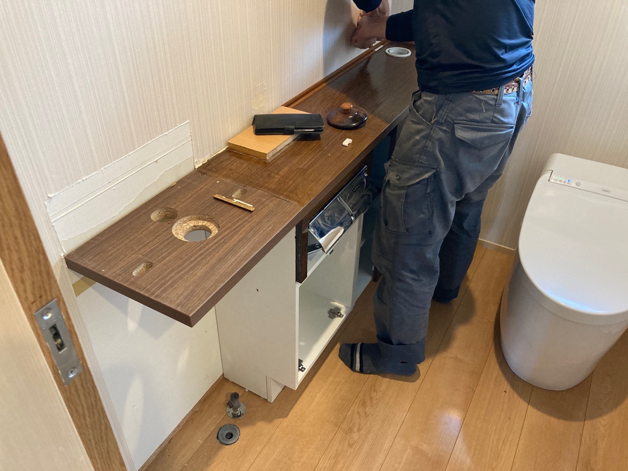 かねてより計画していた西世帯のトイレ手洗いカウンターの取替にうかがいました。既製品のカウンターを手際よく解体していきます。今回は既設の物より少しだけ寸法の大きなものを取付ける計画とし、クロスの貼替は行いませんのでキズを付けないように慎重に取り外していきます。