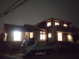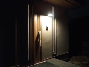 押入の裏側、外壁にあたる部分に照明器具が取り付けられました。庭が広大なため、住宅の外灯が煌々と照らしていても、どこか暗いという印象があるそうです。今回は玄関周りと他2か所に照明器具を増設しました。夜間にどれだけの明るさになるか期待されます。