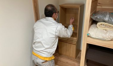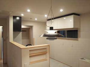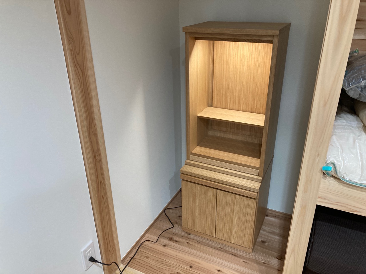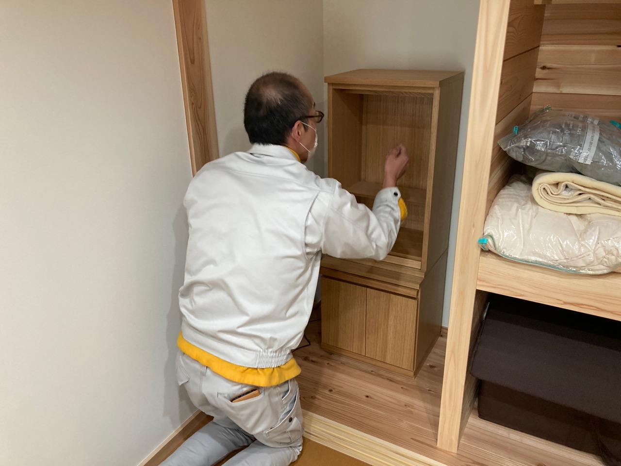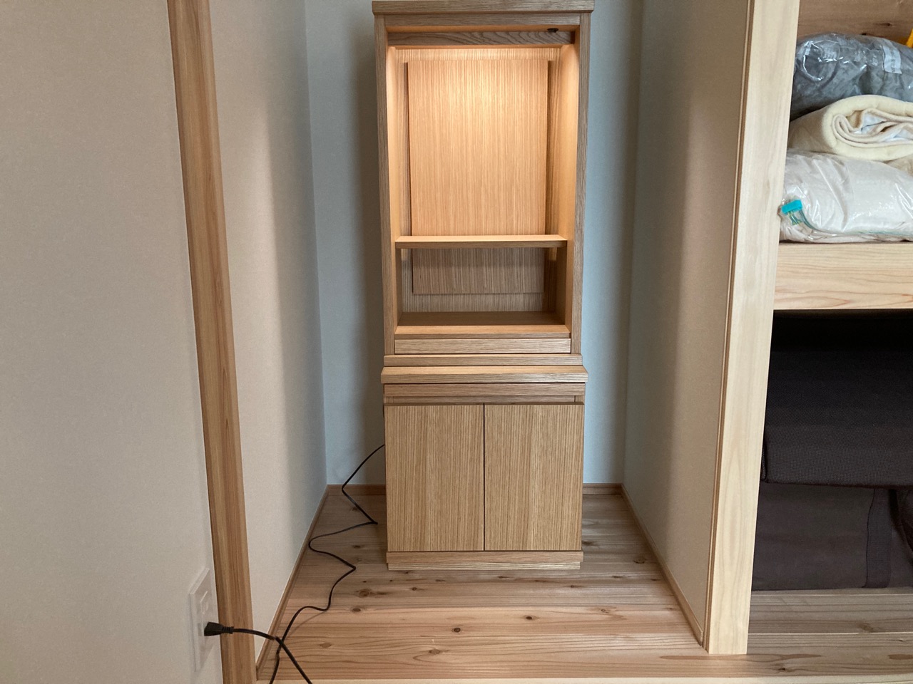 年末にご依頼を受け製作していた家具を設置しにうかがいました。収納の一角ではありますが、将来お仏壇を据える事もできるようにと開けていたスペースに製作した仏壇(正式なものは西世帯にあります)を設置。こちらには今はお寺に預けてある阿弥陀如来像を据えられるそうです。