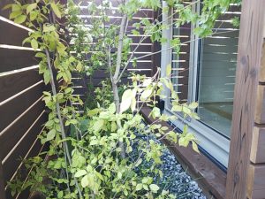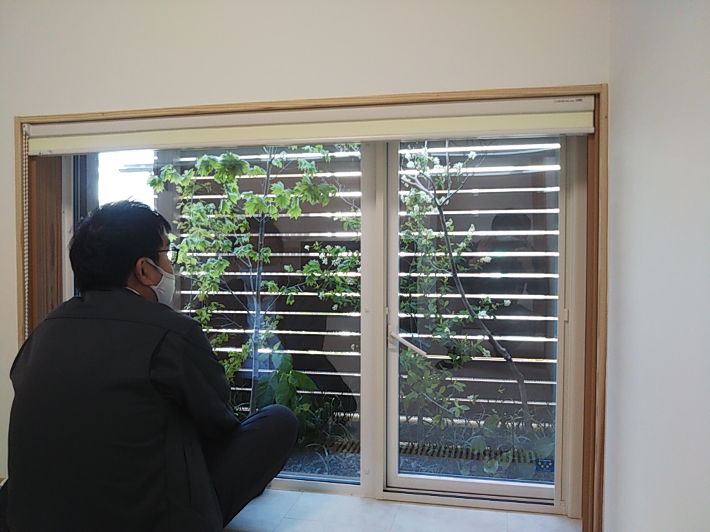 アロマルームの地窓から見える坪庭の植栽も植えてもらいました。早速見え方をチェックされるy様。