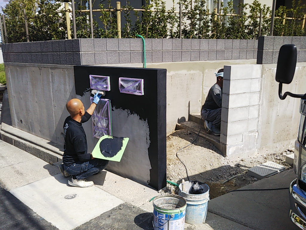 門柱にはコテムラを付けた真っ黒な仕上材が塗られました。ポストや宅配ボックスも黒で統一されています。そのほか擁壁の塗装のための下地均し塗りも行っています。